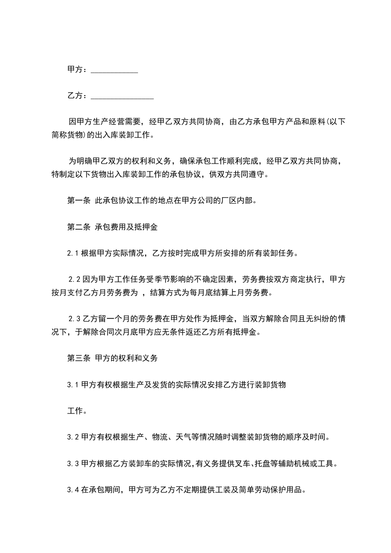 4、1 乙方车辆按计划时间正常到达甲方指定工厂或仓库,如厂方无法即时装货,所产生的压夜费用为 元/天,由甲方支付。