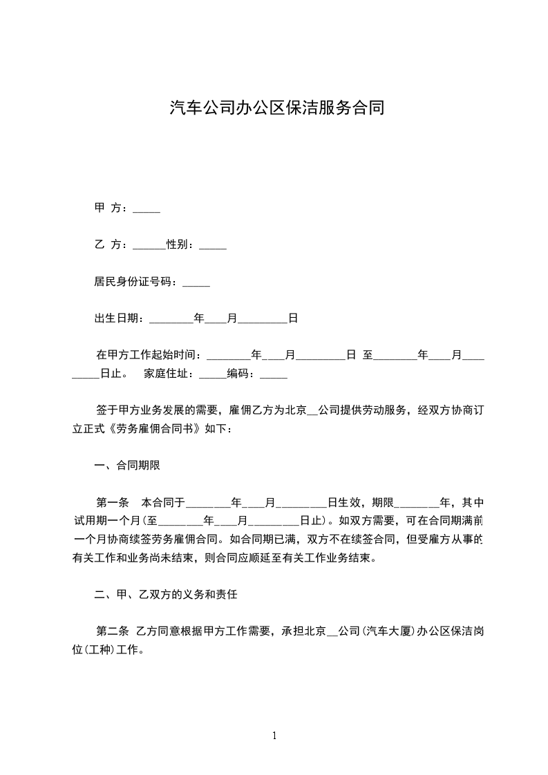 第二条 乙方同意根据甲方工作需要,承担北京__公司(汽车大厦)办公区保洁岗位(工种)工作。