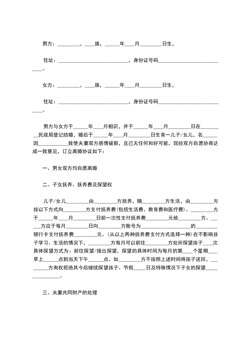 男方与女方于______年____月相识,并于______年____月_________日在_________民政局登记结婚,婚后于______年____月_________日生育一儿子/女儿,名______。因____________致使夫妻双方感情破裂,且已无任何和好可能,现经双方自愿协商达成一致意见,订立离婚协议如下:
