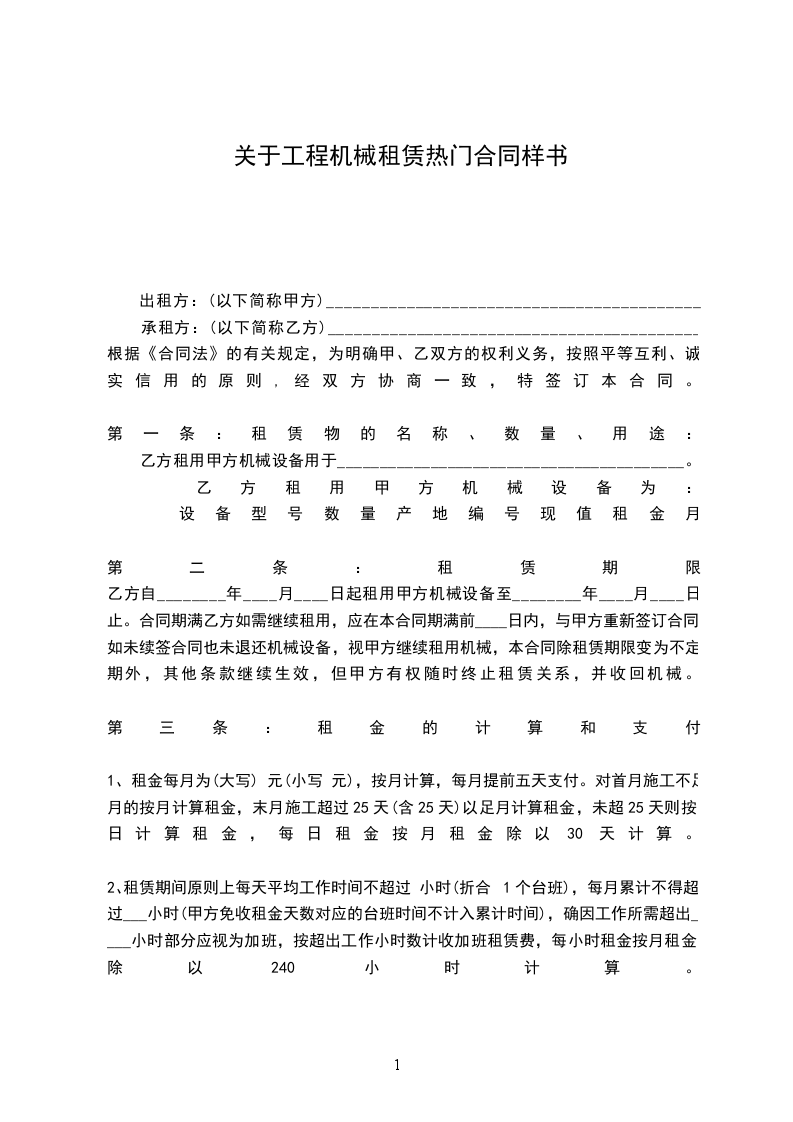 2、租赁期间原则上每天平均工作时间不超过 小时(折合1个台班),每月累计不得超过___小时(甲方免收租金天数对应的台班时间不计入累计时间),确因工作所需超出____小时部分应视为加班,按超出工作小时数计收加班租赁费,每小时租金按月租金除以240小时计算。