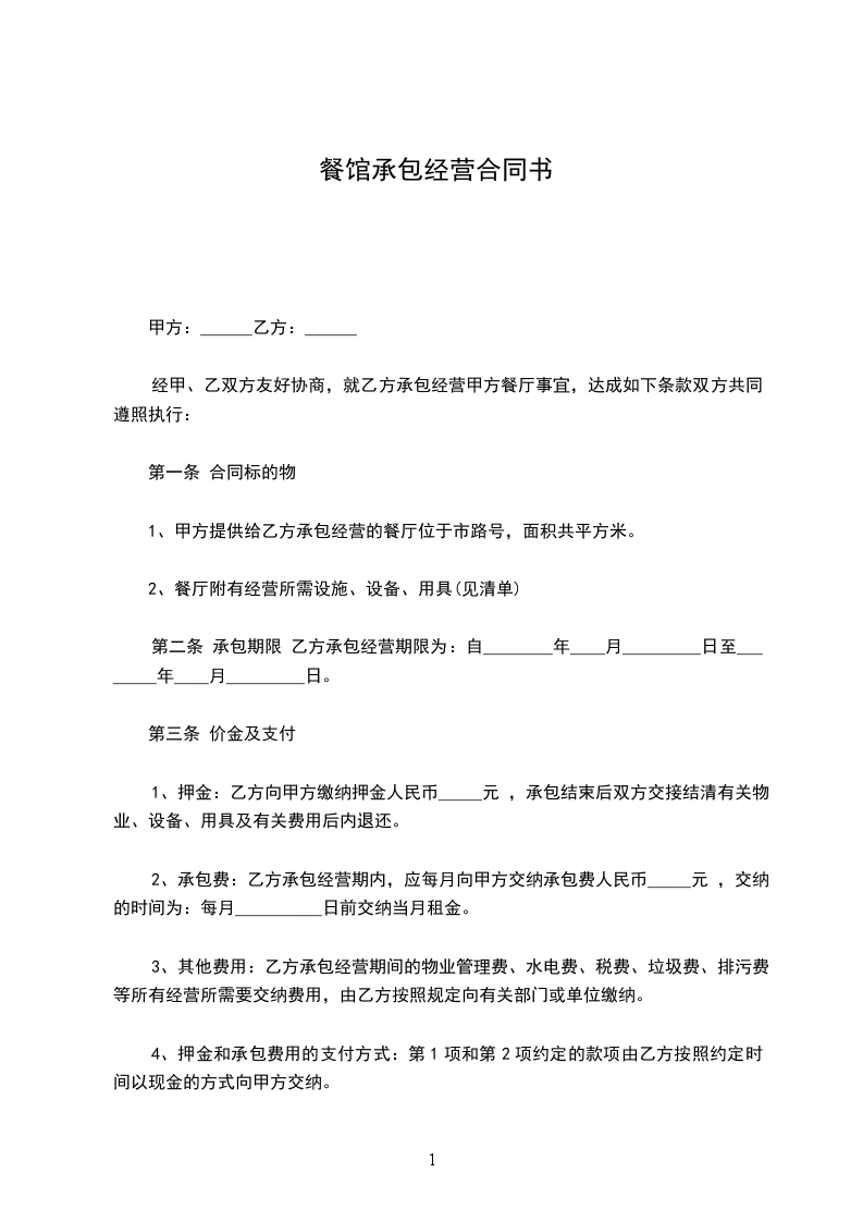 1、押金:乙方向甲方缴纳押金人民币_____元 ,承包结束后双方交接结清有关物业、设备、用具及有关费用后内退还。