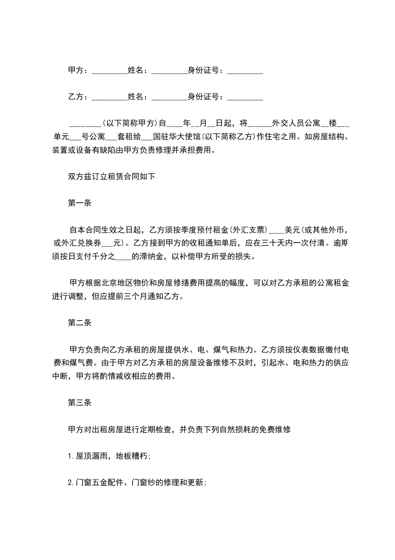 ________(以下简称甲方)自____年__月__日起,将______外交人员公寓__楼___单元___号公寓___套租给___国驻华大使馆(以下简称乙方)作住宅之用。如房屋结构、装置或设备有缺陷由甲方负责修理并承担费用。