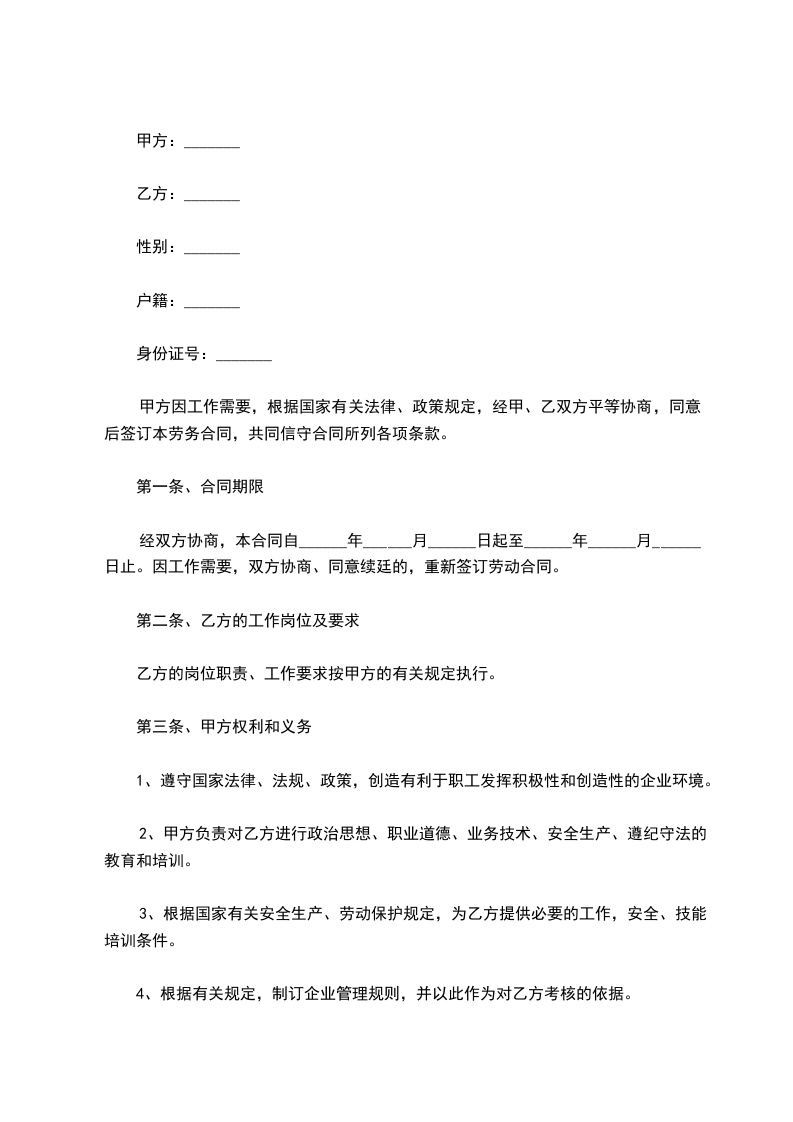 经双方协商,本合同自______年______月___________日起至______年______月___________日止。因工作需要,双方协商、同意续廷的,重新签订劳动合同。