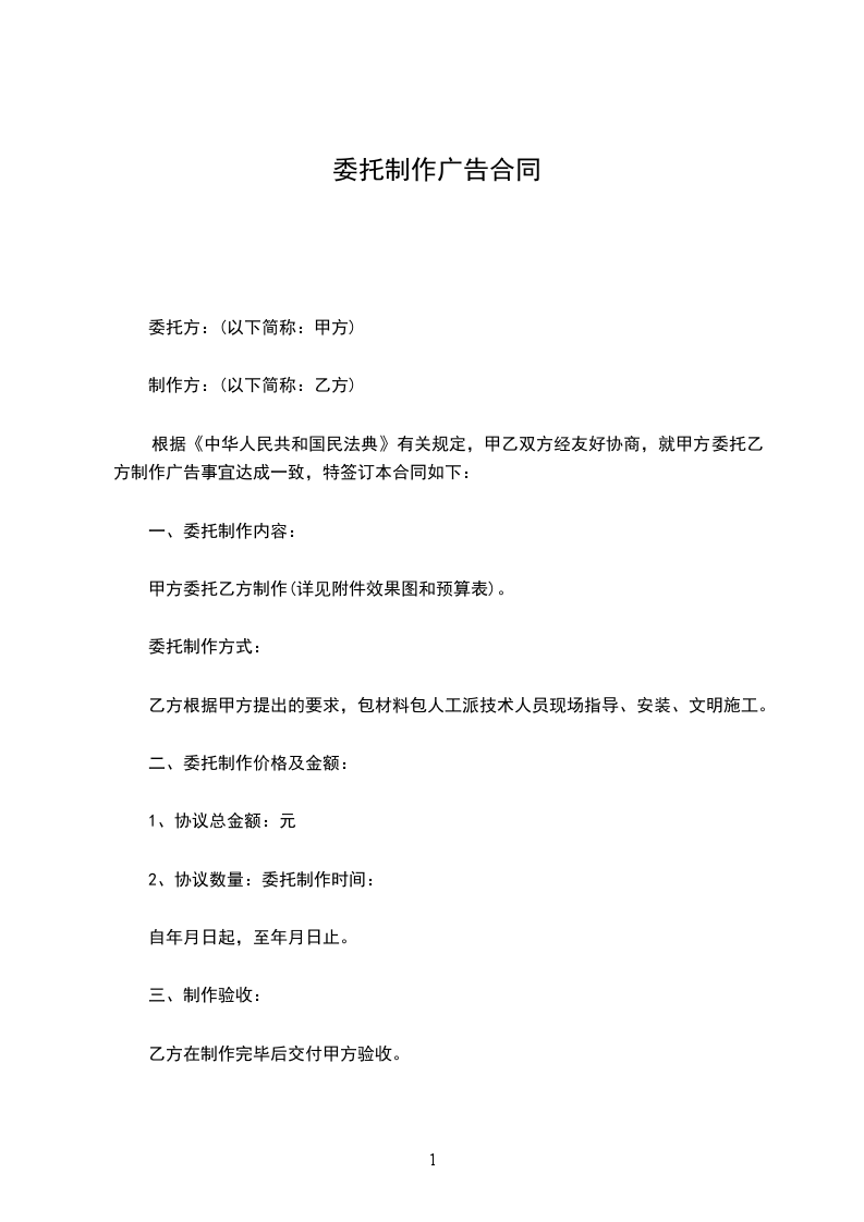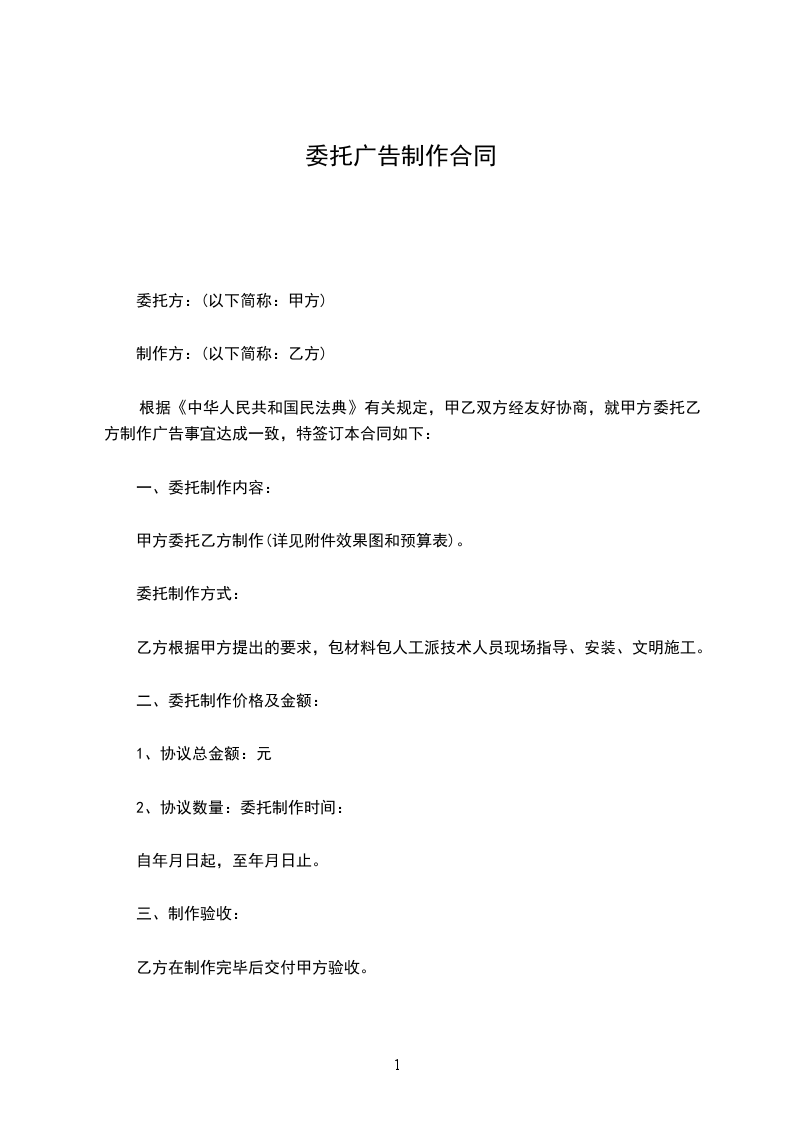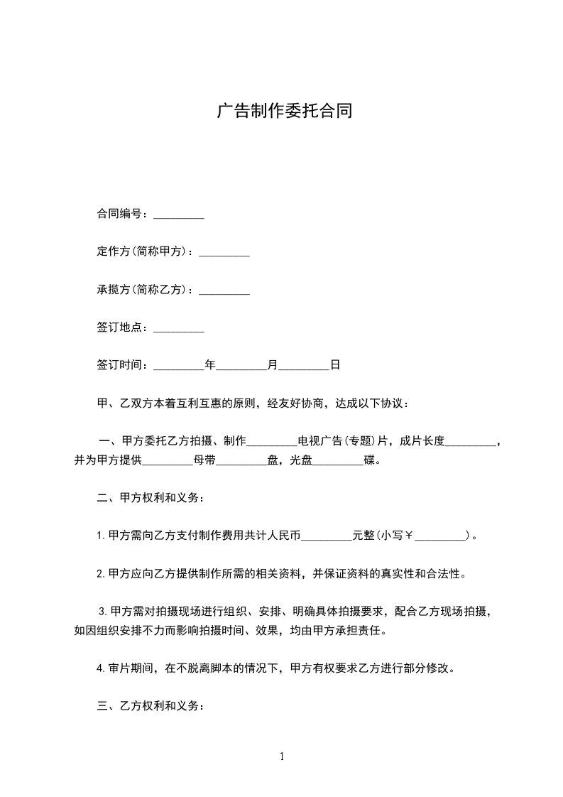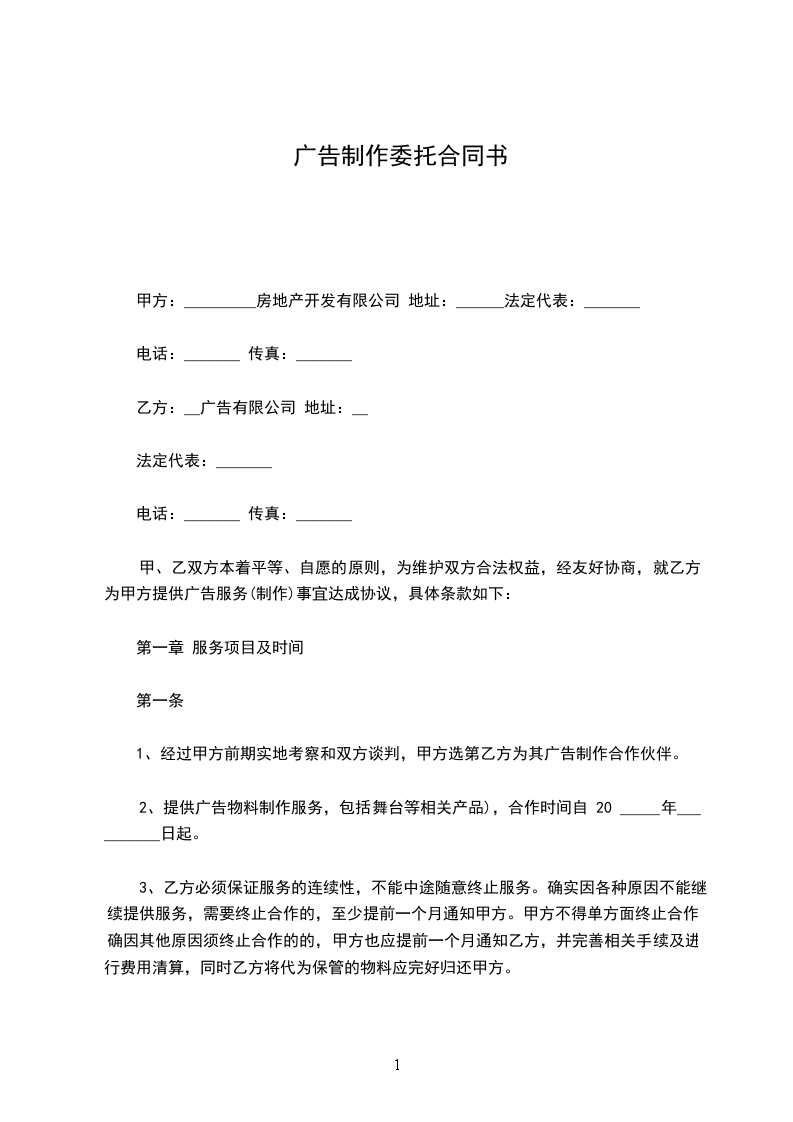 1、经过甲方前期实地考察和双方谈判,甲方选第乙方为其广告制作合作伙伴。