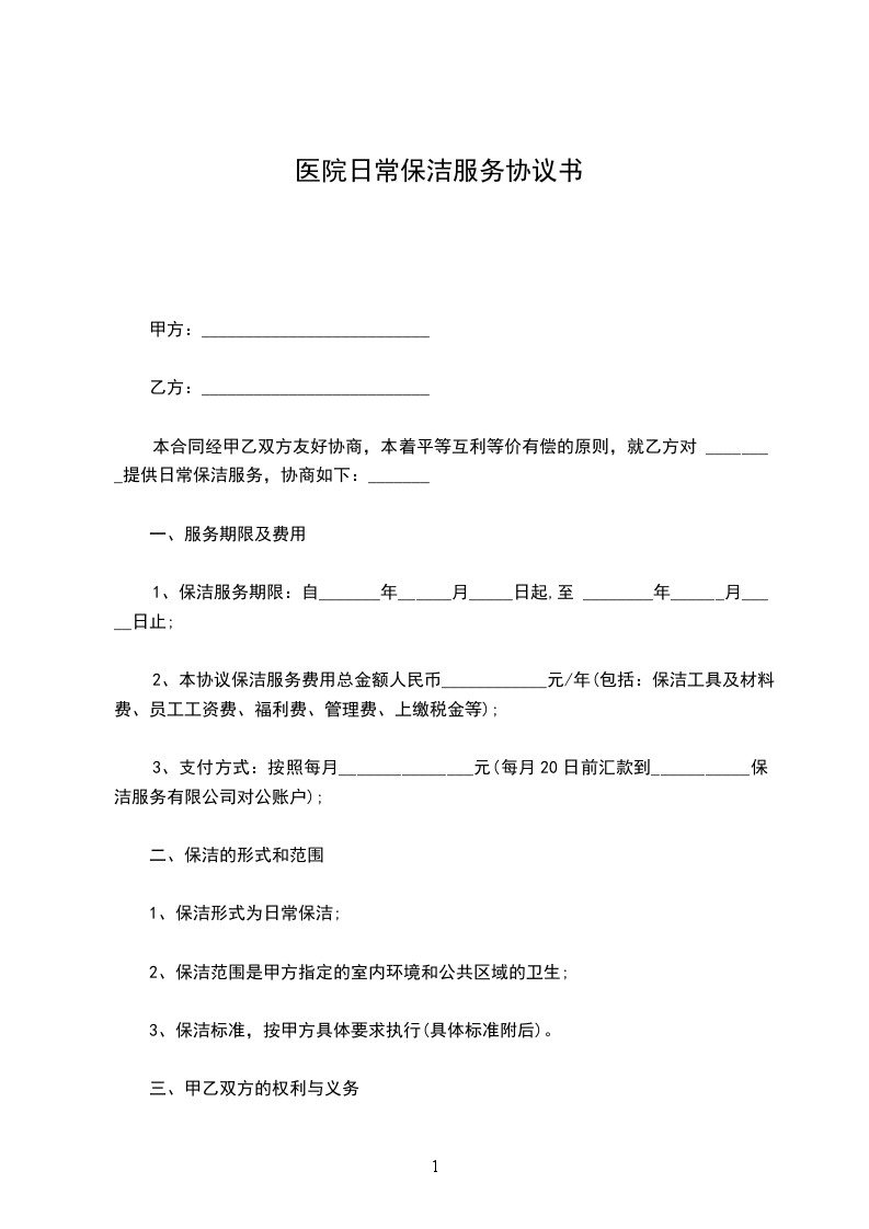 本合同经甲乙双方友好协商,本着平等互利等价有偿的原则,就乙方对 ________提供日常保洁服务,协商如下:_______