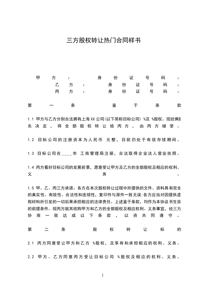 1.1 甲方与乙方分别合法拥有上海XX公司(以下简称目标公司) %及 %股权。现经俩股东决定,将全部股权转让给丙方,由丙方继受。