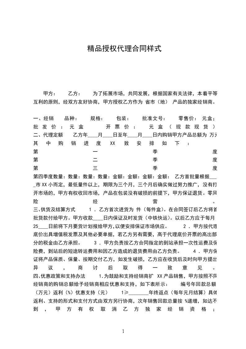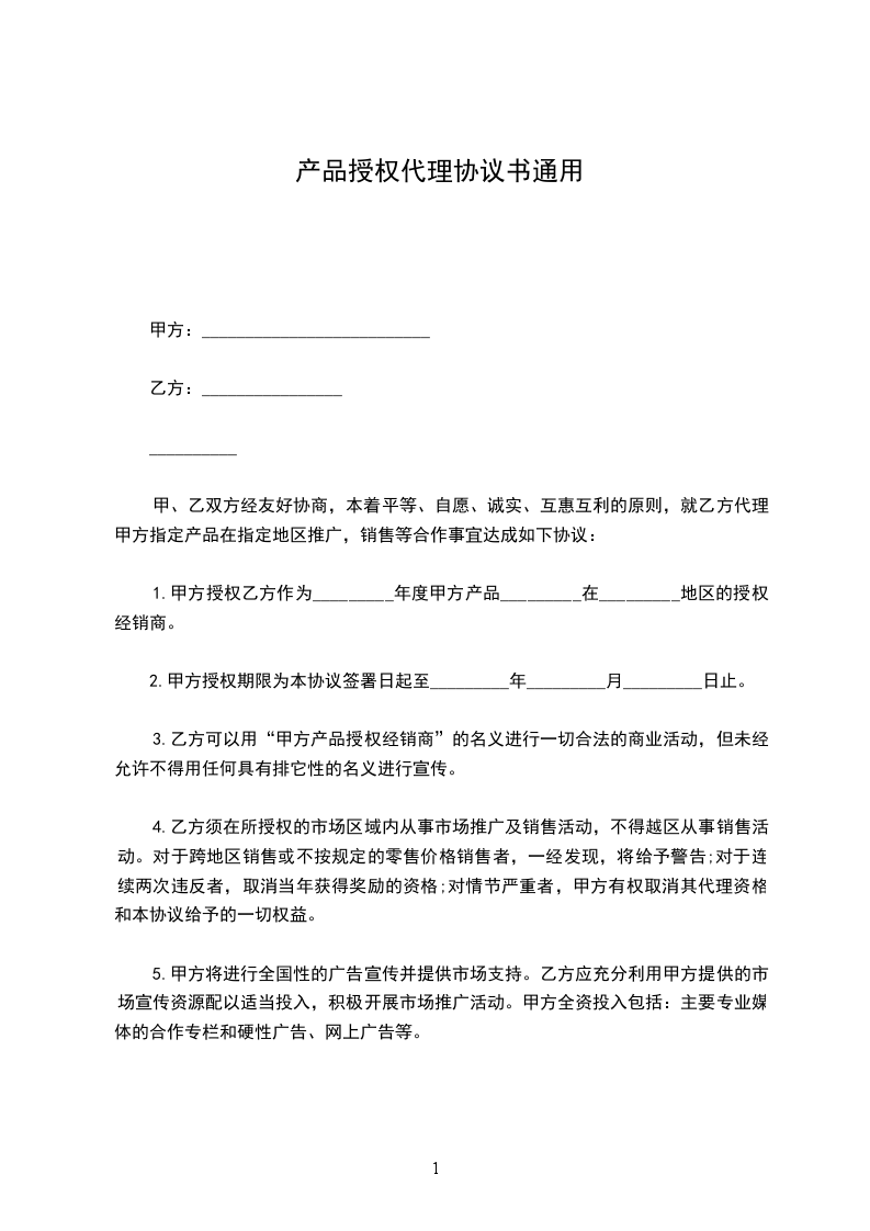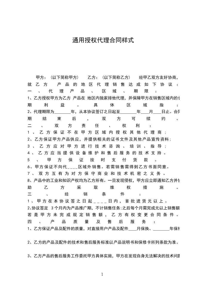 1、乙方授权甲方为乙方 产品在 地区内独家排他代理,并保障甲方在销售区域内的长期利益。具体区域指: