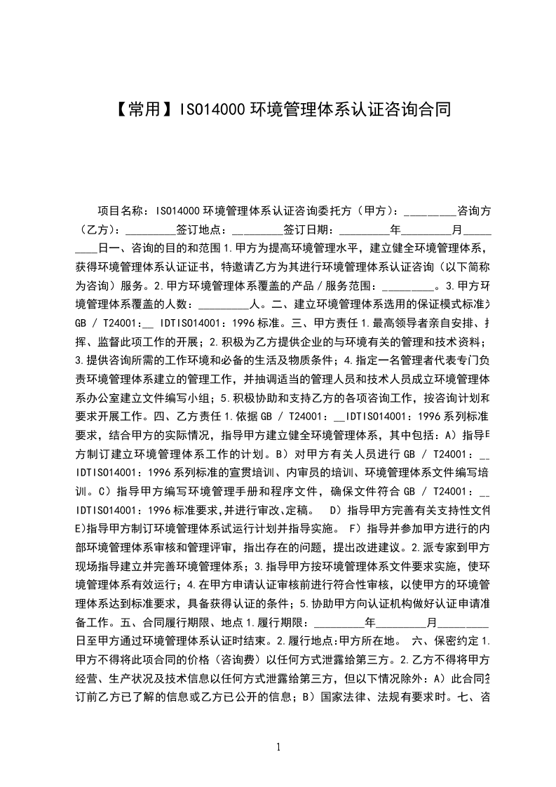1.甲方为提高质量与环境综合管理水平,建立健全综合管理体系,获得9001:与14001:1996认证证书,特邀请乙方为其进行综合管理体系认证咨询(以下简称为咨询)服务。