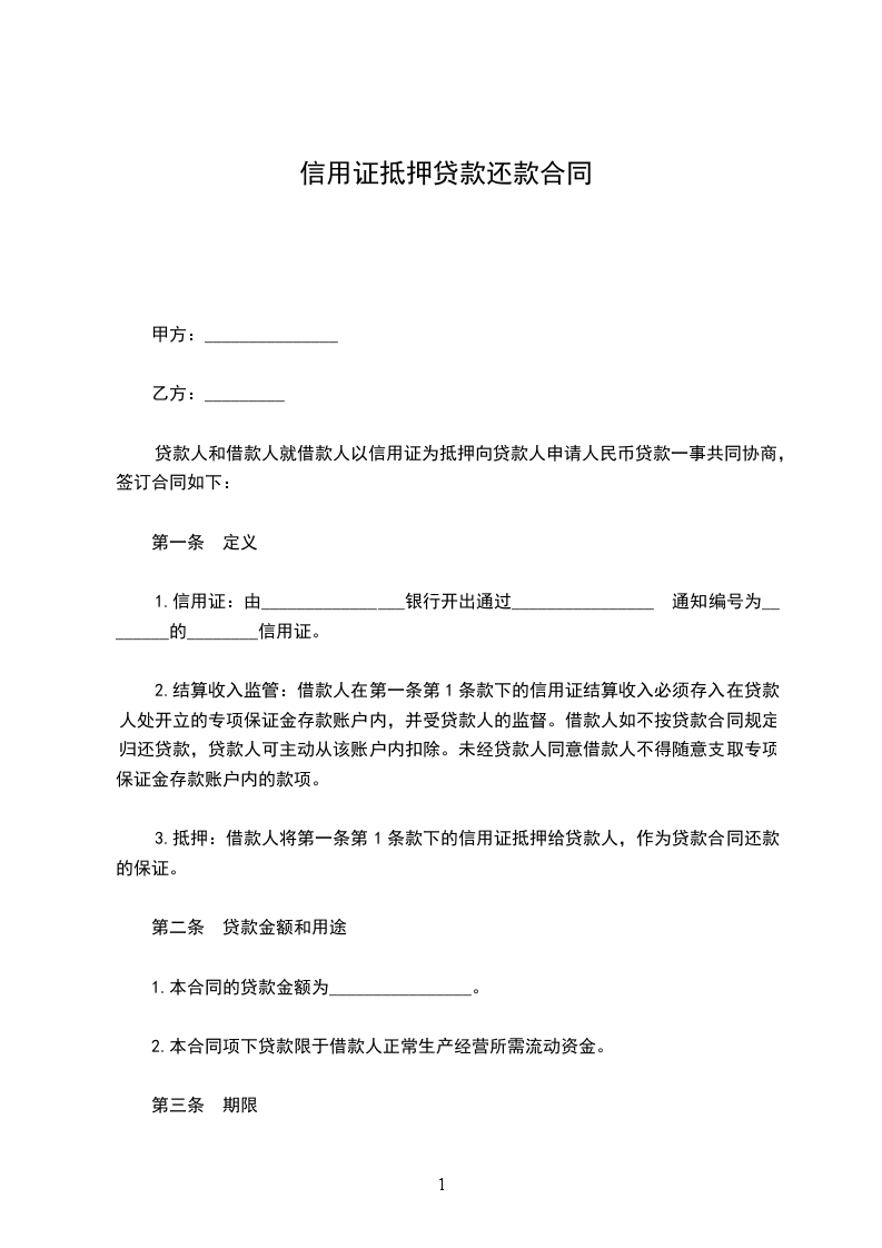 1.本合同签订之_____日起借款人将第一条第1条款下的信用证正本抵押给贷款人,并由贷款人保管。