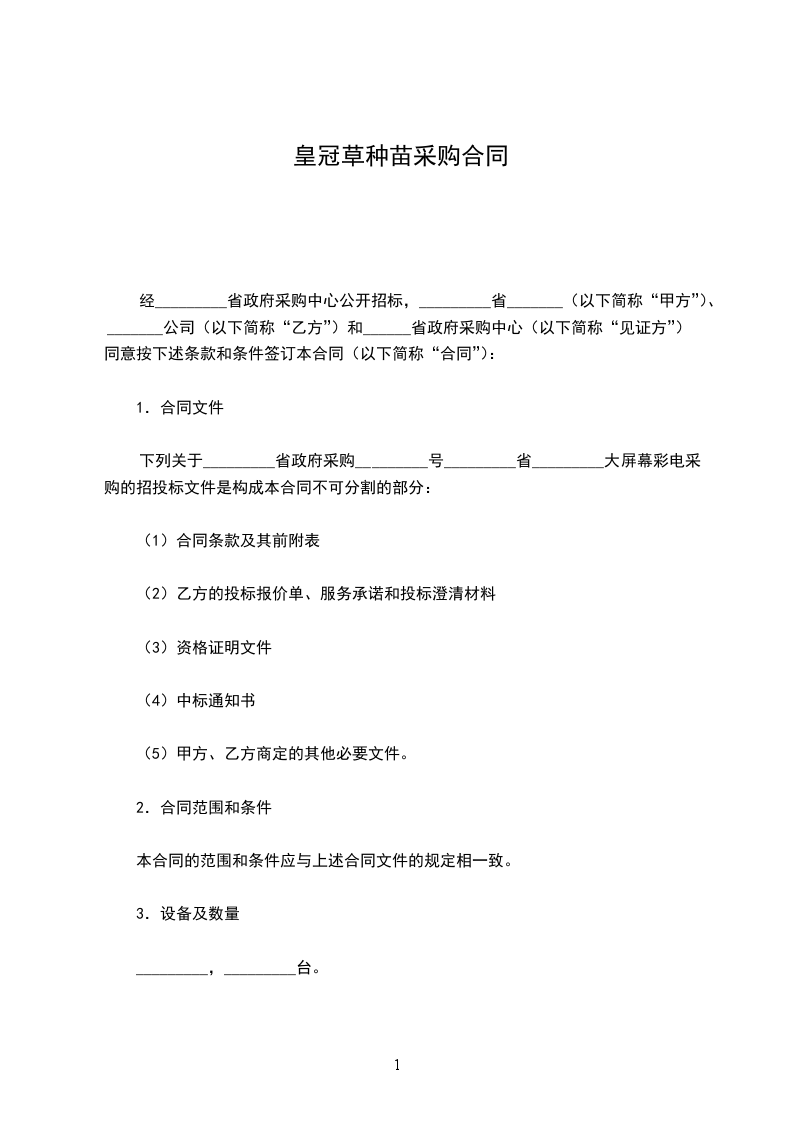 经_________省政府采购中心公开招标,_________省_______(以下简称“甲方”)、_______公司(以下简称“乙方”)和______省政府采购中心(以下简称“见证方”)同意按下述条款和条件签订本合同(以下简称“合同”):