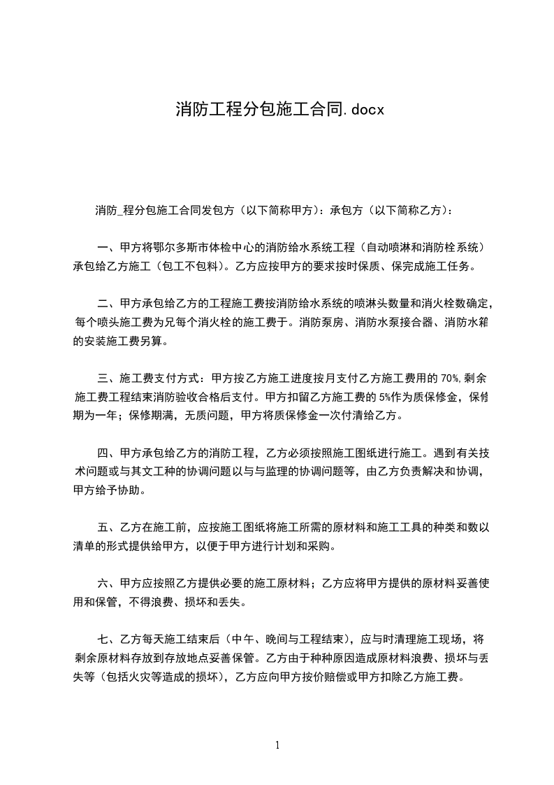 (3)乙方工程如不符合消防验收规范需要返工,所造成的一切损失由乙方承担,在施工期间因甲方造成的损失应由甲方承担,在工程完工后由甲方造成的人为损坏由甲方全权负责。