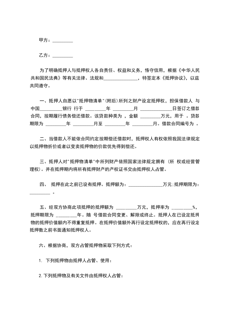 一、抵押人自愿以"抵押物清单"(附后)所列之财产设定抵押权,担保借款人 与中国__________银行 行于 _________年 _________月 ______________日签订之借款合同,按期履行债务偿还借款。该贷款种类为 ,金额 _________万元,用于 。贷款期限为 _________年 _________月至 _________年 _________月。借款合同编号为 。