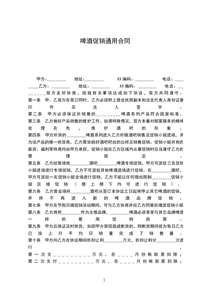 第四条 甲方所供的_________啤酒系列进入乙方所辖酒吧销售及促销小姐进场,并为该产品的唯一供货商,乙方需协助好酒吧吧台的出样及销售促销。促销小姐所有的薪资、福利等待遇均由甲方承担,促销小姐在乙方区域内从事促销时应当遵守乙方的管理规定。