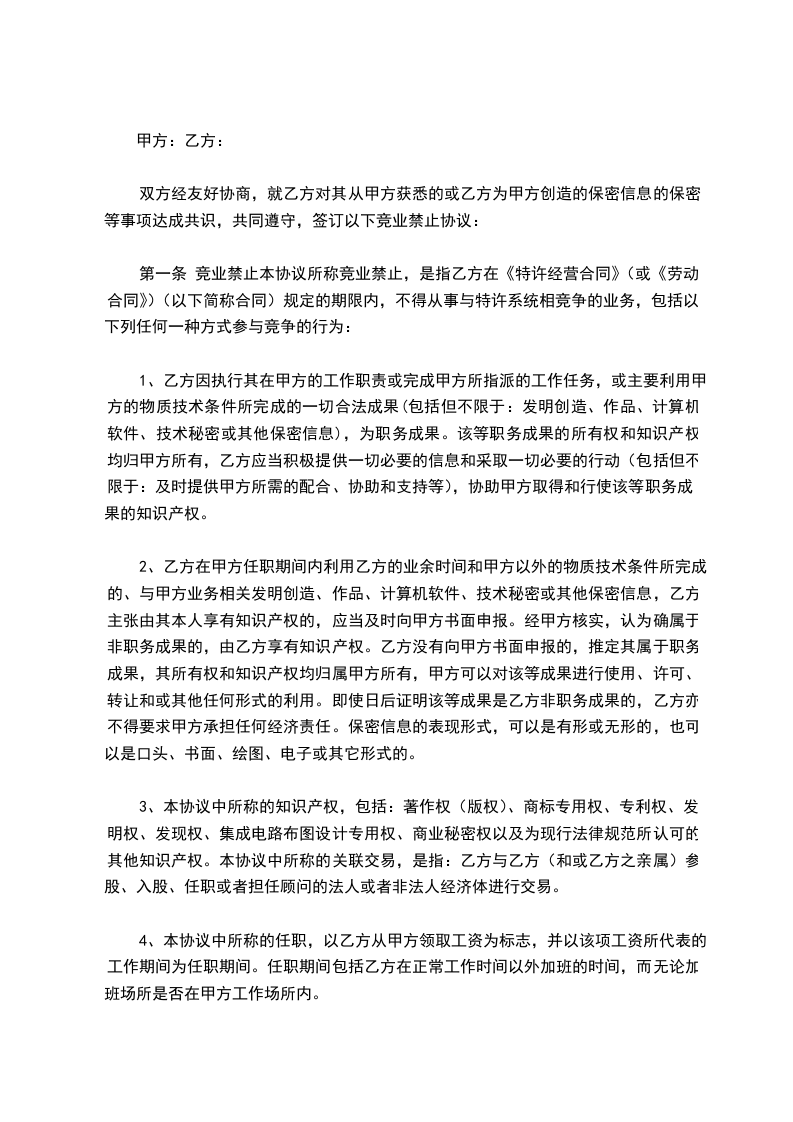 第一条 竞业禁止本协议所称竞业禁止,是指乙方在《特许经营合同》(或《劳动合同》)(以下简称合同)规定的期限内,不得从事与特许系统相竞争的业务,包括以下列任何一种方式参与竞争的行为: