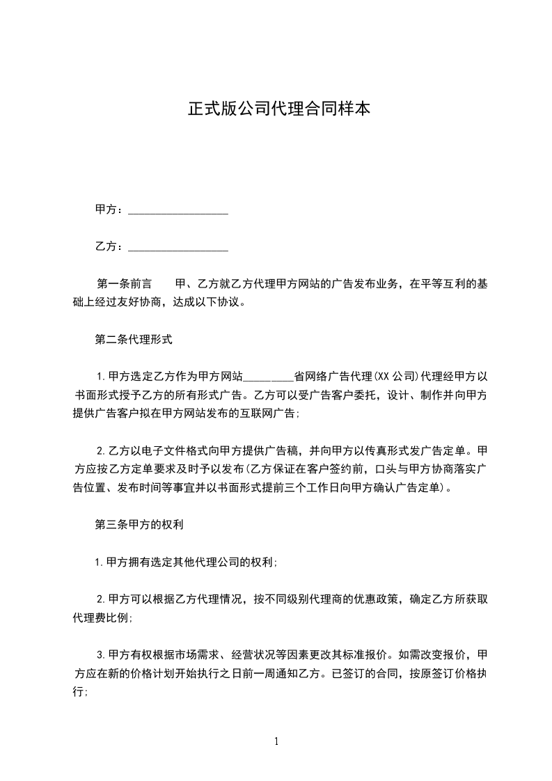 一、甲方通过对乙方广告经营资格及经营能力的认证,决定将中国_______________省(市)_________市(区)_________区(县)的《_________》(________年版)图书、光盘、网站系列广告媒体非独家地区代理权授予乙方。