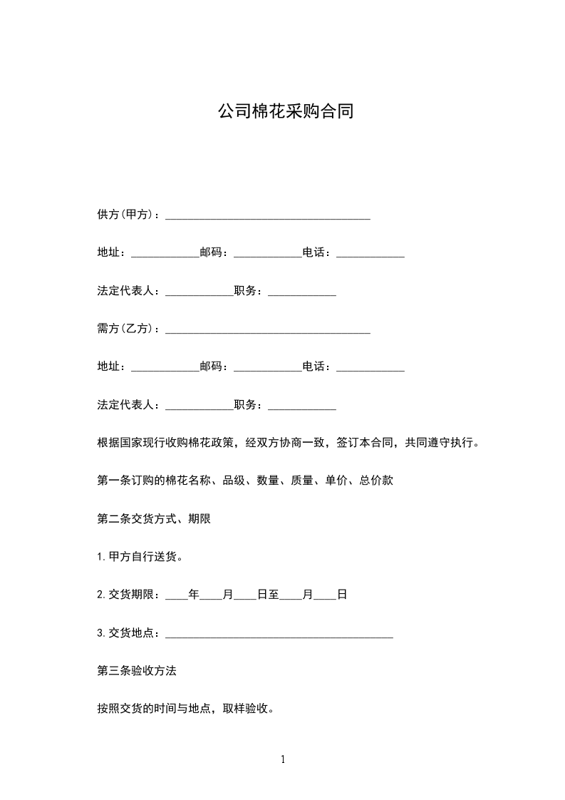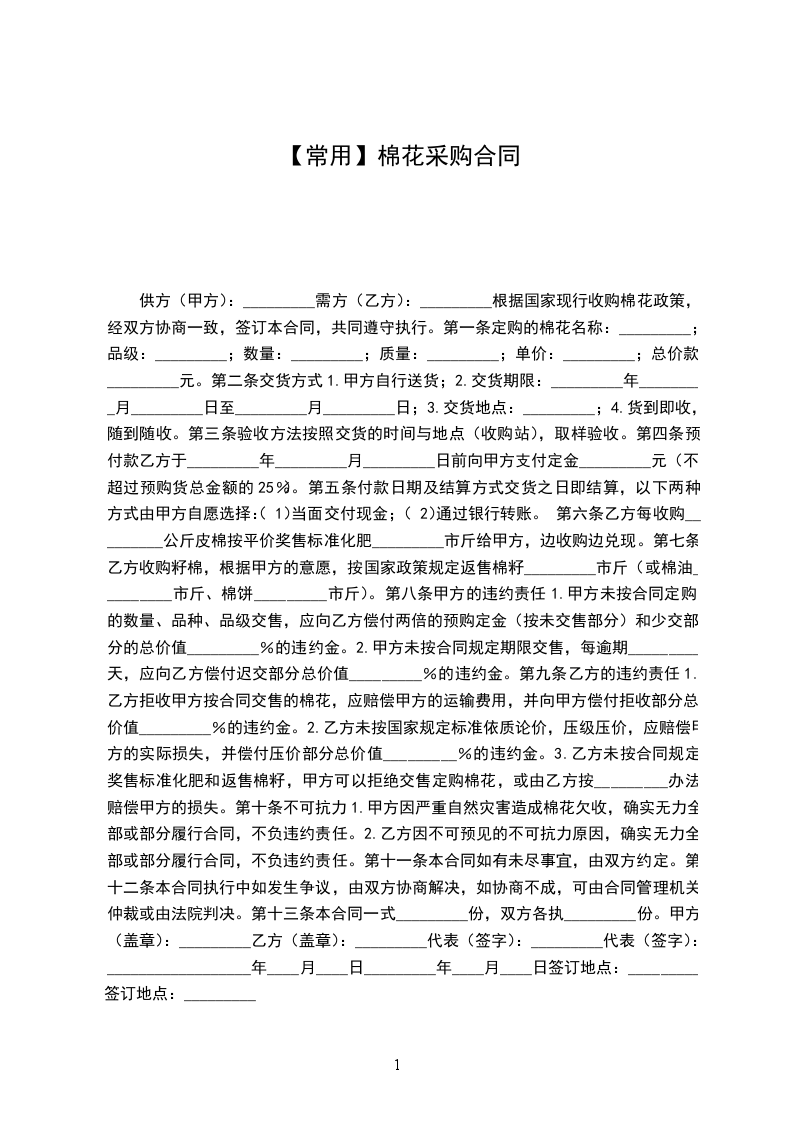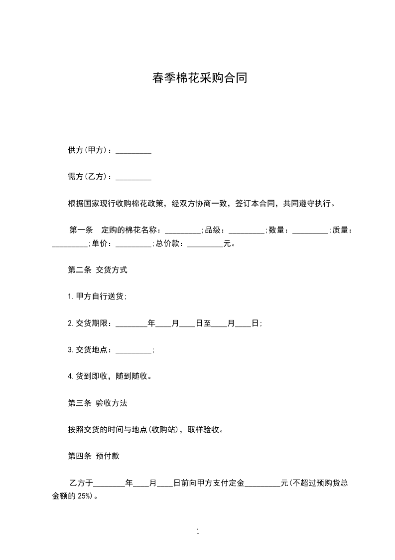 第一条 定购的棉花名称:_________;品级:_________;数量:_________;质量:_________;单价:_________;总价款:_________元。