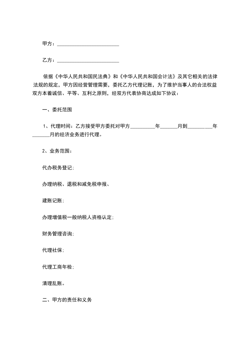 1.时间:乙方接受甲方委托对甲方________年____月到________年____月的经济业务进行代理记账。
