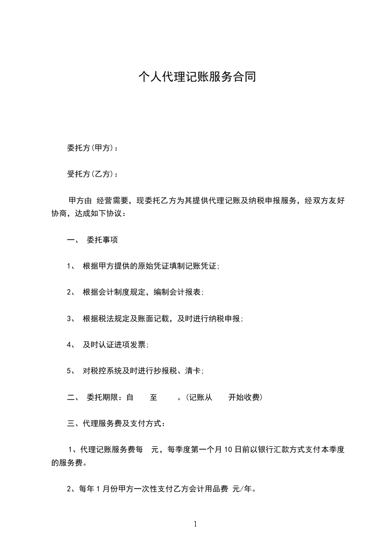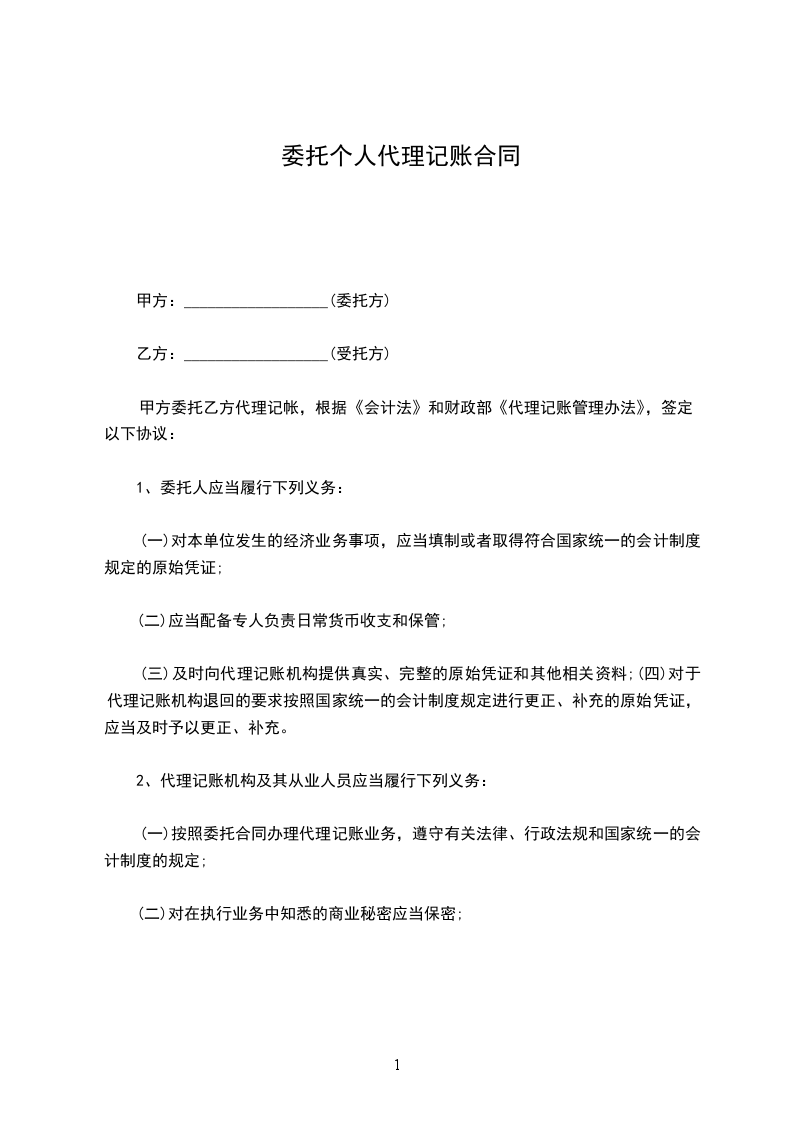 2.由于乙方原因,未能及时完成会计核算,造成一定后果的,乙方必须及时纠正并承担相应的责任。 甲方签章: 乙方签章: 代表人签字: 代表人签字: 签字日期: 签字日期: 个人代理记账合同【2】 台顾字(20__)第______号 委托人(甲方):__________________________ 受托人(乙方):北京XX公司 兹有__________________________________________(甲方)因经营管理的需要,特聘请市会计服务有限公司(乙方)的中国注册税务师、会计师为本企业办理税务、涉税会计事务的常年顾问。 经双方协商,达成如下协议: