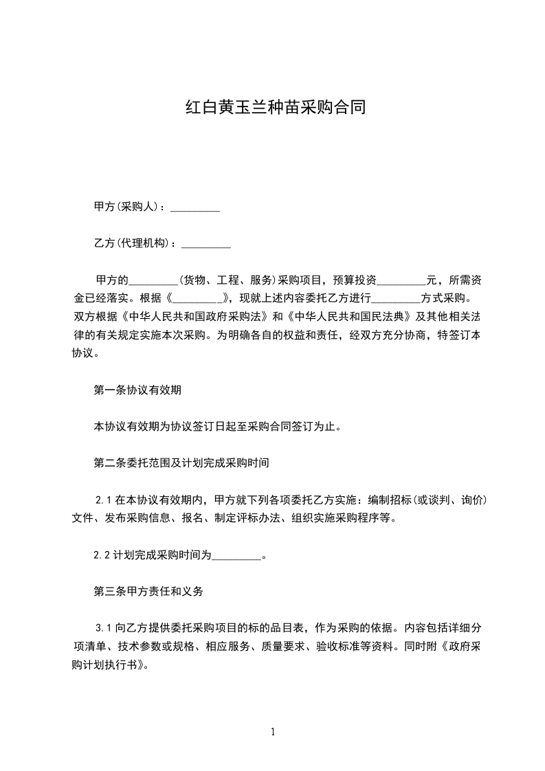 甲方的_________(货物、工程、服务)采购项目,预算投资_________元,所需资金已经落实。根据《_________》,现就上述内容委托乙方进行_________方式采购。双方根据《中华人民共和国政府采购法》和《中华人民共和国民法典》及其他相关法律的有关规定实施本次采购。为明确各自的权益和责任,经双方充分协商,特签订本协议。