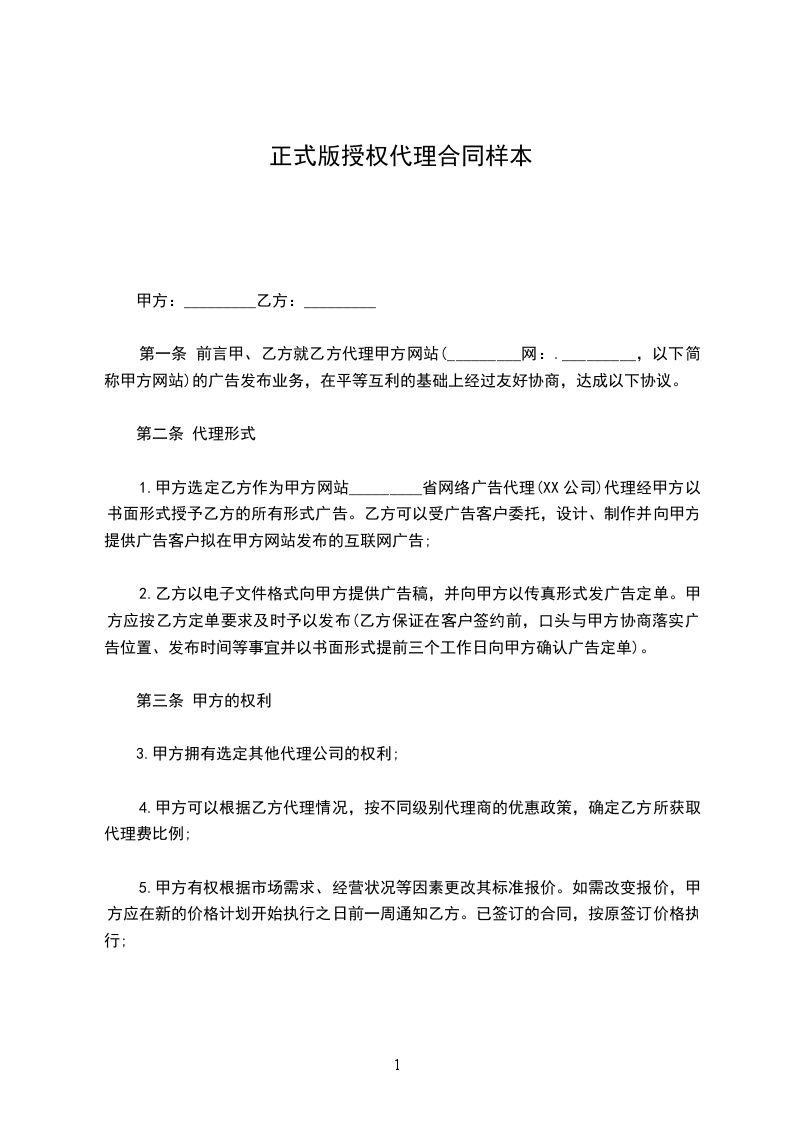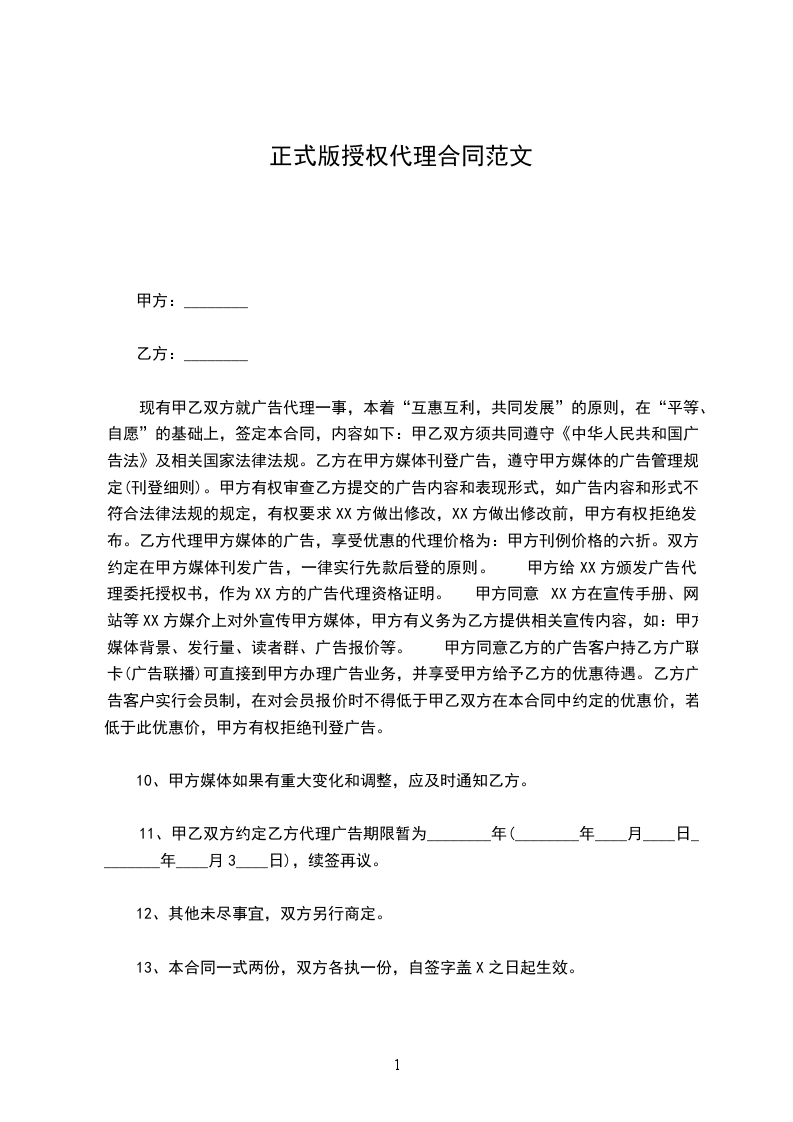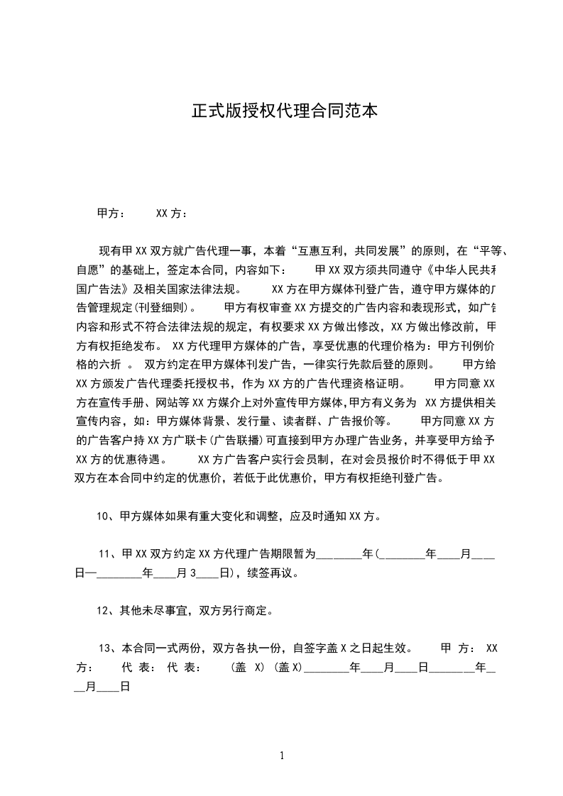现有甲XX双方就广告代理一事,本着“互惠互利,共同发展”的原则,在“平等、自愿”的基础上,签定本合同,内容如下: 甲XX双方须共同遵守《中华人民共和国广告法》及相关国家法律法规。 XX方在甲方媒体刊登广告,遵守甲方媒体的广告管理规定(刊登细则)。 甲方有权审查XX方提交的广告内容和表现形式,如广告内容和形式不符合法律法规的规定,有权要求XX方做出修改,XX方做出修改前,甲方有权拒绝发布。 XX方代理甲方媒体的广告,享受优惠的代理价格为:甲方刊例价格的六折 。 双方约定在甲方媒体刊发广告,一律实行先款后登的原则。 甲方给XX方颁发广告代理委托授权书,作为XX方的广告代理资格证明。 甲方同意XX方在宣传手册、网站等XX方媒介上对外宣传甲方媒体,甲方有义务为XX方提供相关宣传内容,如:甲方媒体背景、发行量、读者群、广告报价等。 甲方同意XX方的广告客户持XX方广联卡(广告联播)可直接到甲方办理广告业务,并享受甲方给予XX方的优惠待遇。 XX方广告客户实行会员制,在对会员报价时不得低于甲XX双方在本合同中约定的优惠价,若低于此优惠价,甲方有权拒绝刊登广告。