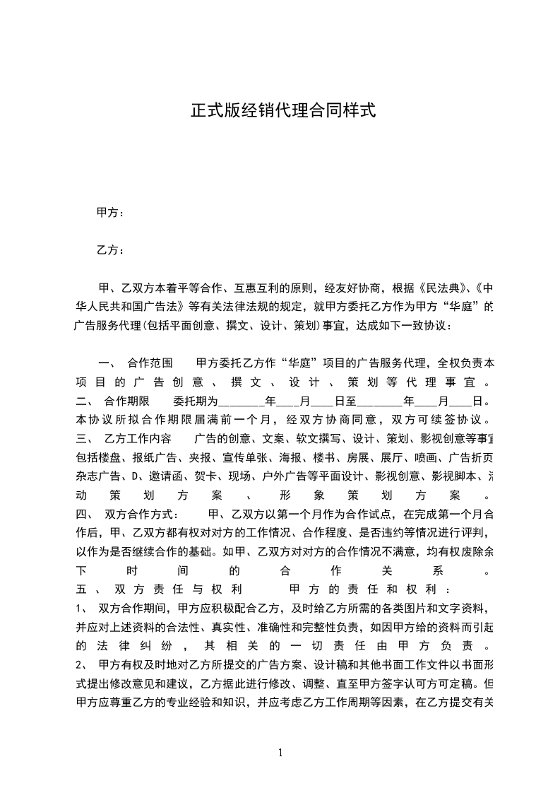 一、 合作范围 甲方委托乙方作“华庭”项目的广告服务代理,全权负责本项目的广告创意、撰文、设计、策划等代理事宜。