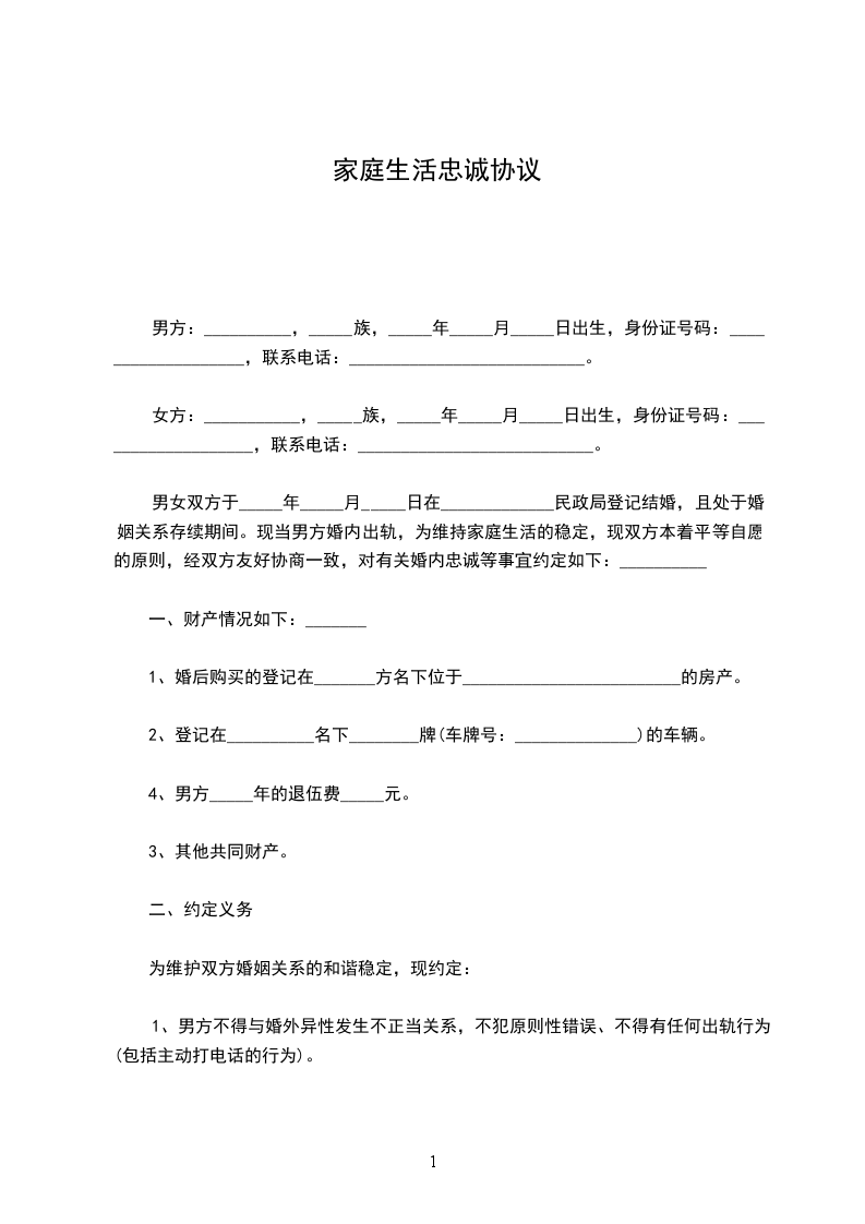 男女双方于_____年_____月_____日在_____________民政局登记结婚,且处于婚姻关系存续期间。现当男方婚内出轨,为维持家庭生活的稳定,现双方本着平等自愿的原则,经双方友好协商一致,对有关婚内忠诚等事宜约定如下:__________