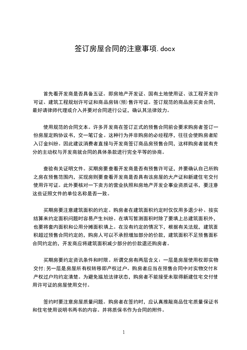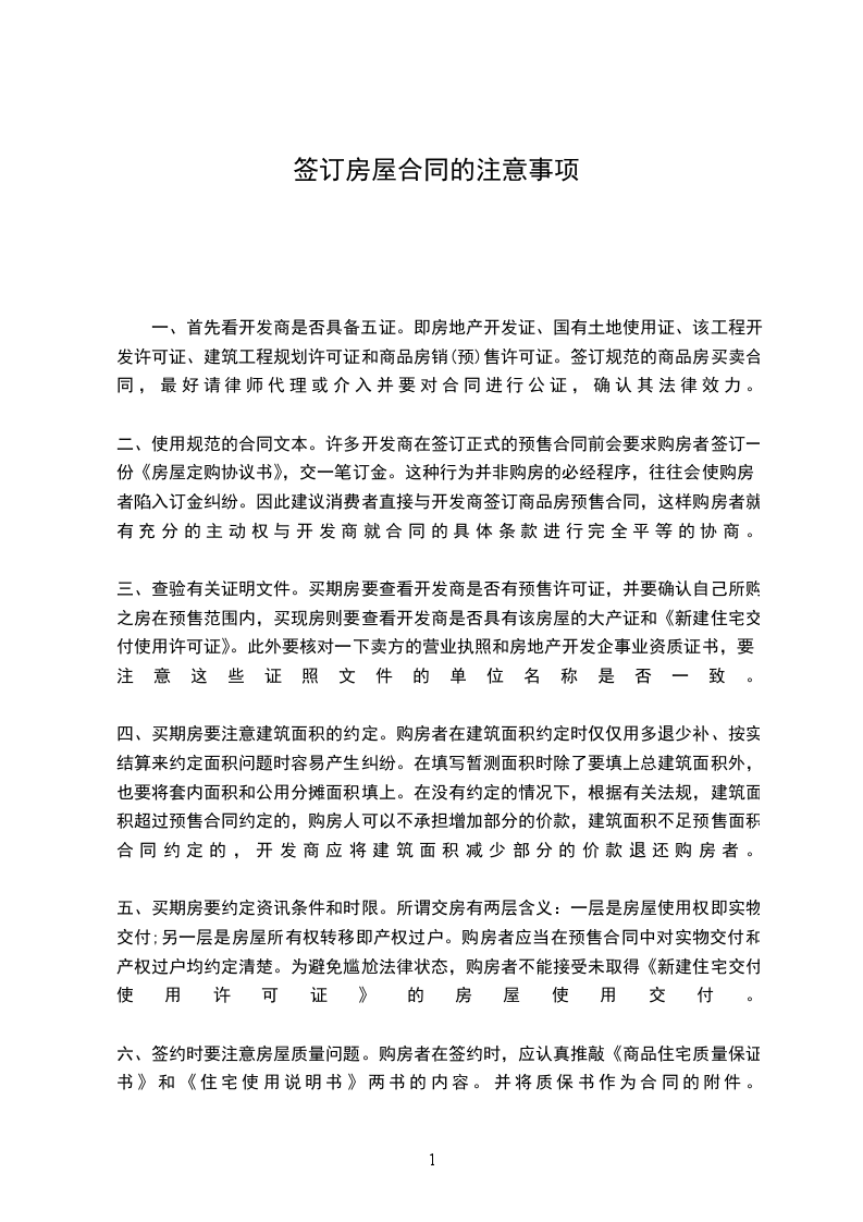 二、使用规范的合同文本。许多开发商在签订正式的预售合同前会要求购房者签订一份《房屋定购协议书》,交一笔订金。这种行为并非购房的必经程序,往往会使购房者陷入订金纠纷。因此建议消费者直接与开发商签订商品房预售合同,这样购房者就有充分的主动权与开发商就合同的具体条款进行完全平等的协商。