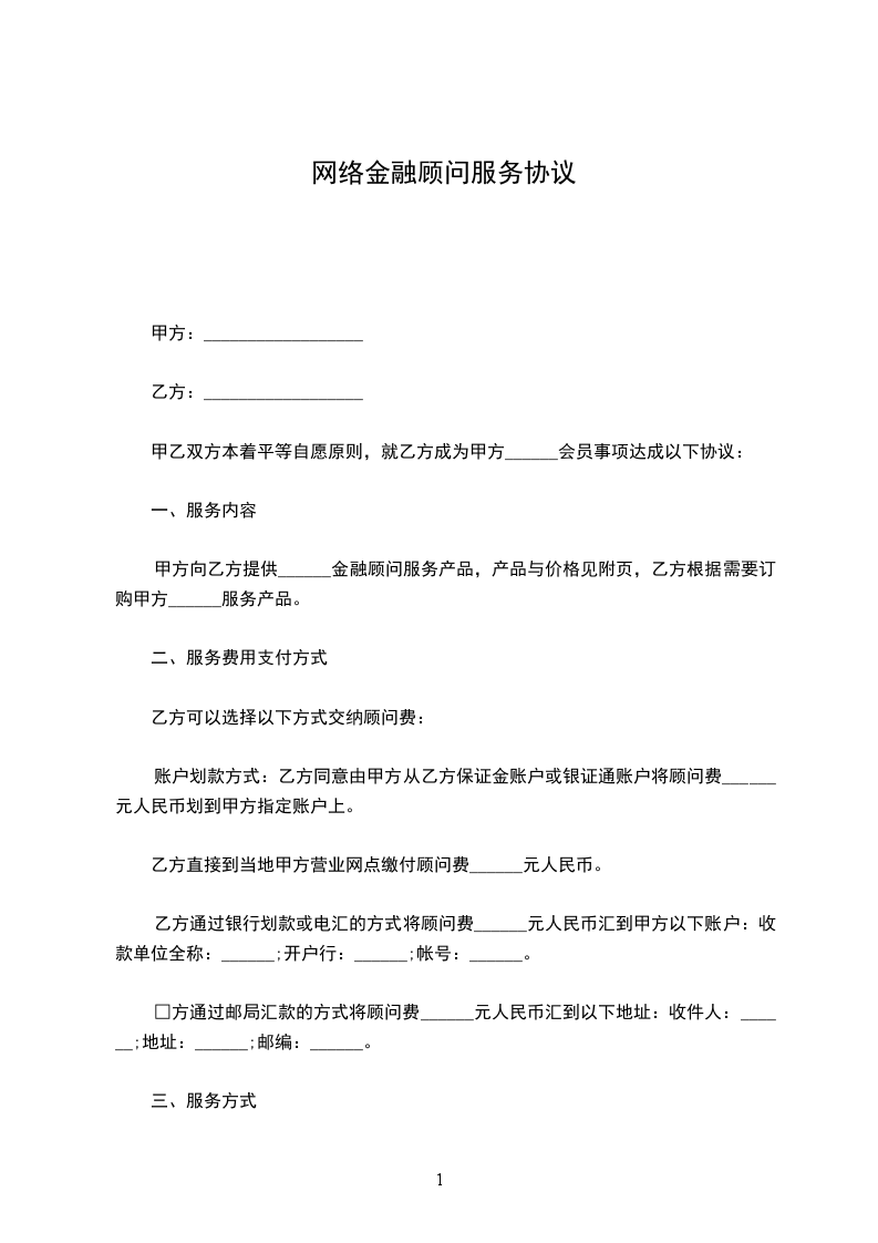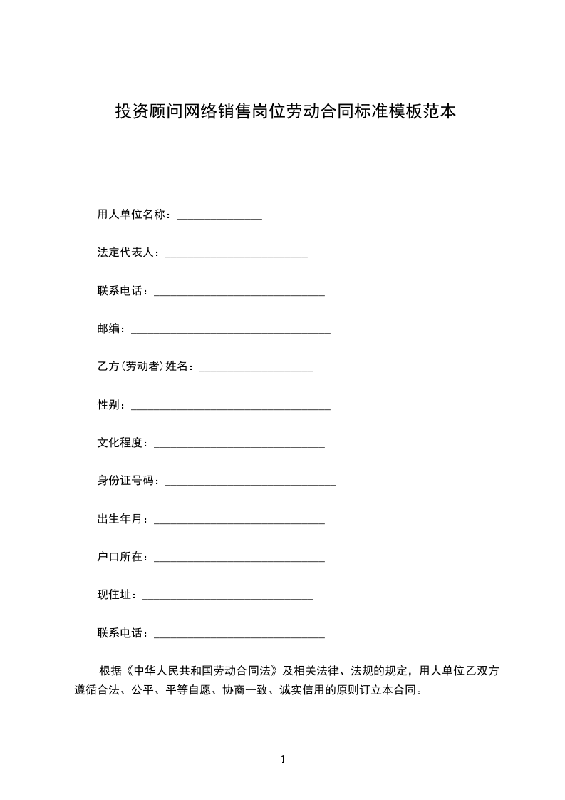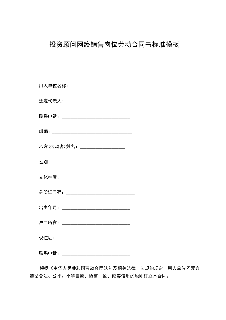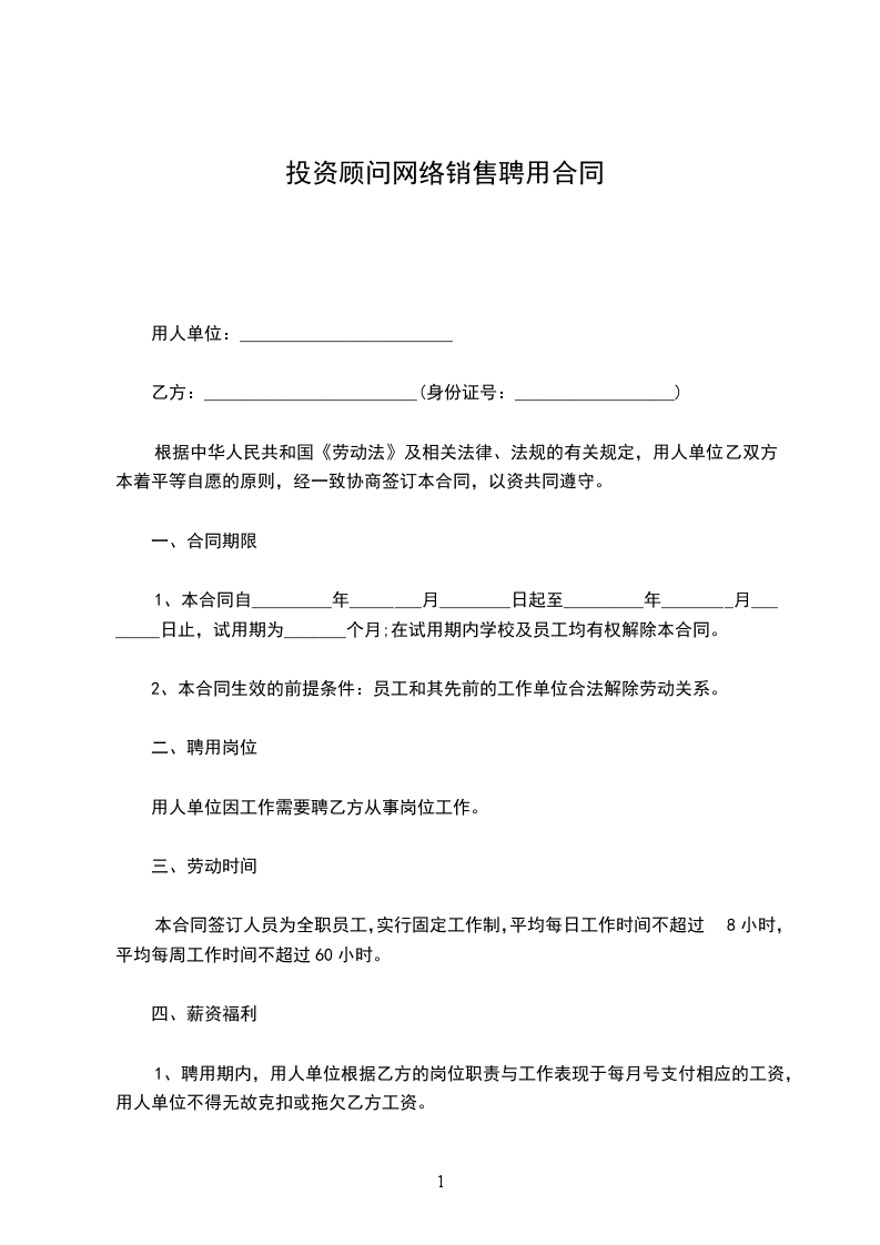 投资顾问网络销售招聘合同