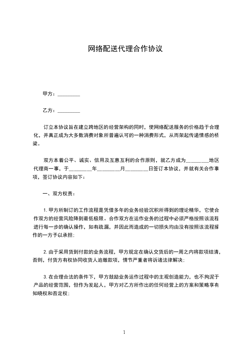 订立本协议旨在建立跨地区的经营架构的同时,使网络配送服务的价格趋于合理化,并真正成为大多数消费对象所普遍认可的一种消费形式,从而架起传递情感的桥梁。
