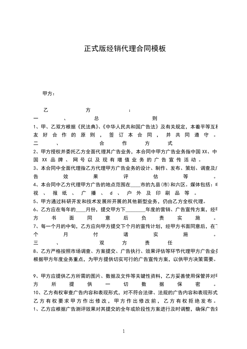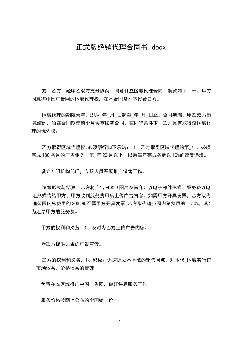 1.3代理期限自________年____月____日至________年____月____日(自________年____月刊到________年____月刊)。如乙方完成任务且未给甲方造成任何经济、名誉或其他损失的,甲乙双方可于下________年度续签本协议,具体代理费用的涨幅甲乙双方根据市场商定,原则上涨幅不超过20%。