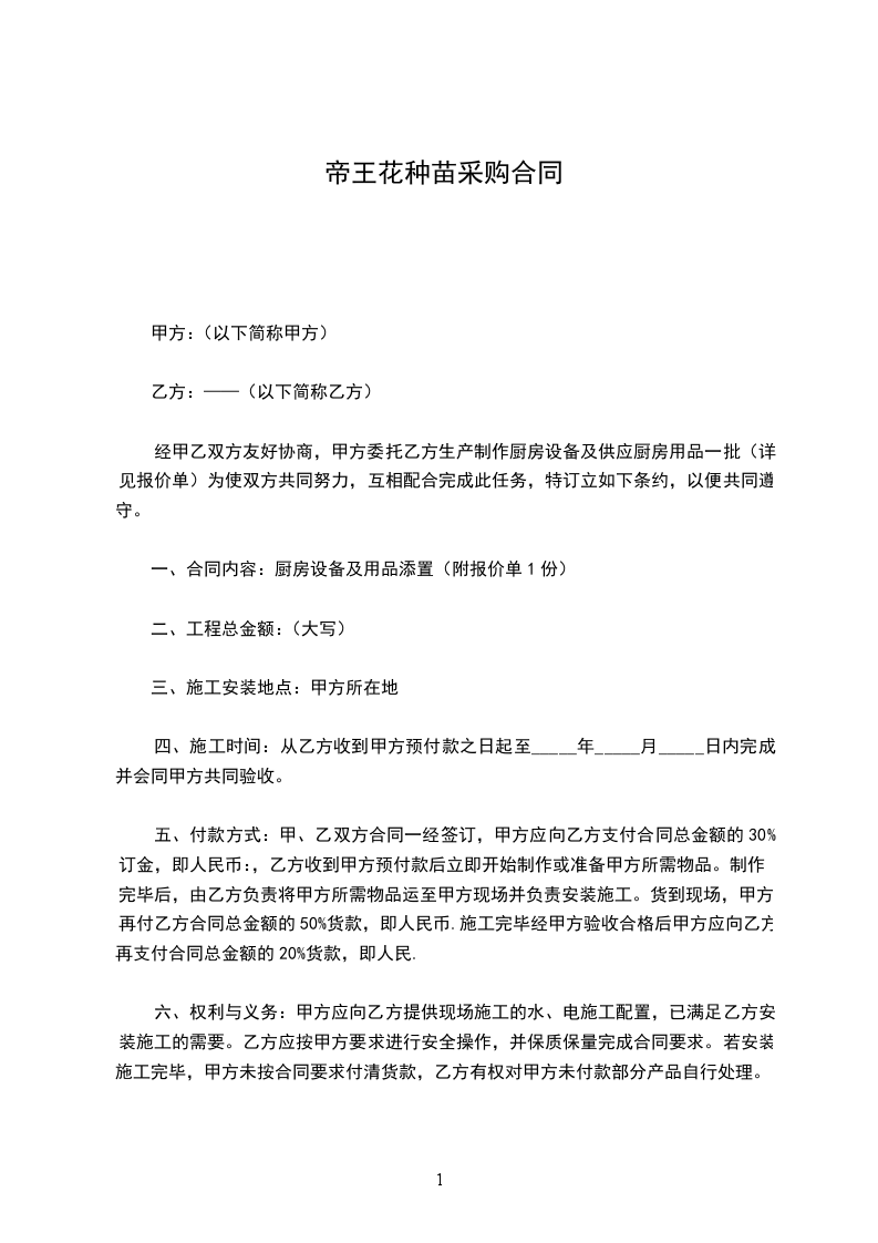 经甲乙双方友好协商,甲方委托乙方生产制作厨房设备及供应厨房用品一批(详见报价单)为使双方共同努力,互相配合完成此任务,特订立如下条约,以便共同遵守。