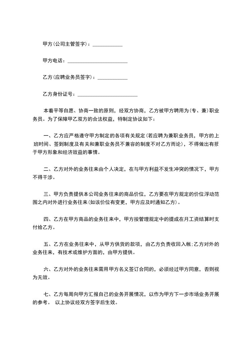 七、乙方每周向甲方汇报自己的业务开展情况,以作为甲方下一步市场业务开展的参考。 以上协议经双方签字后生效。