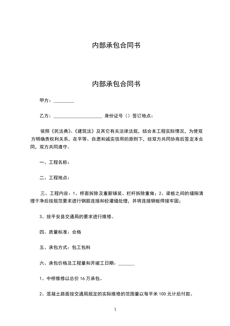 第九条项目部内部管理1、材料采购:所有材料由乙方亲自采购,或者由乙方书面授权方可有效。所有入账之材料发票必须由乙方签字方可入帐。2、工程施工管理①项目经理:项目经理由乙方担任,所有与建设单位的工作联系、签证的签署均由乙方负责。②技术人员:技术人员由甲方委派,协助乙方施工。③施工人员:3、人员管理:4、施工场地管理: