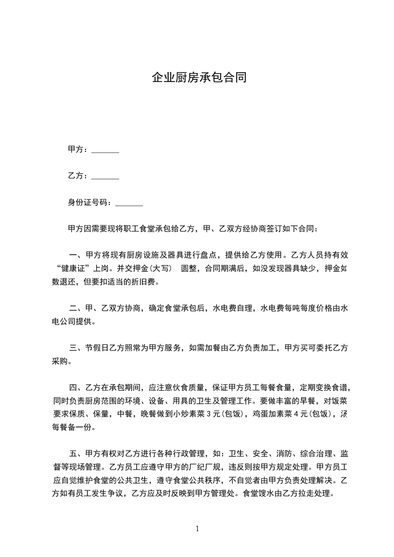 一、甲方将现有厨房设施及器具进行盘点,提供给乙方使用。乙方人员持有效“健康证”上岗。并交押金(大写) 圆整,合同期满后,如没发现器具缺少,押金如数退还,但要扣适当的折旧费。