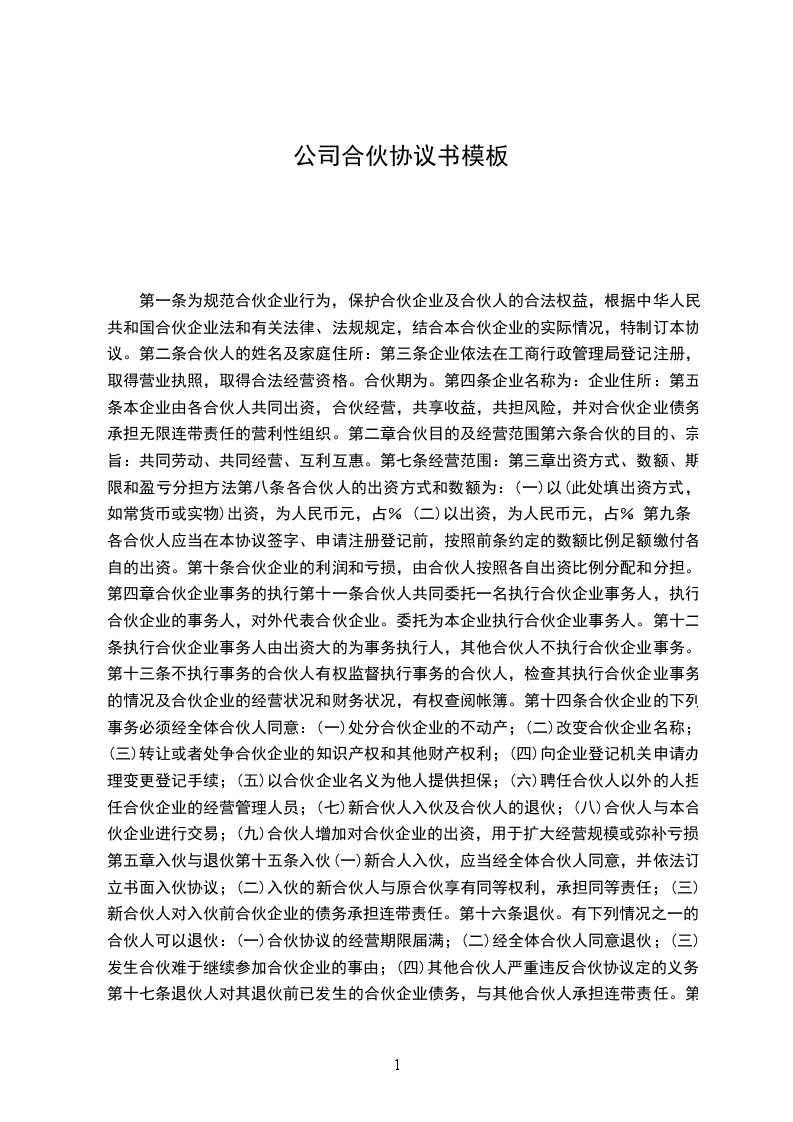 现有甲、乙、丙、丁__合股(合伙)开办一家__________________,全面实施__共同投资、共同合作经营的决策,成立股份制公司。经__合伙人平等协商,本着互利合作的原则,签订本协议,以供信守。