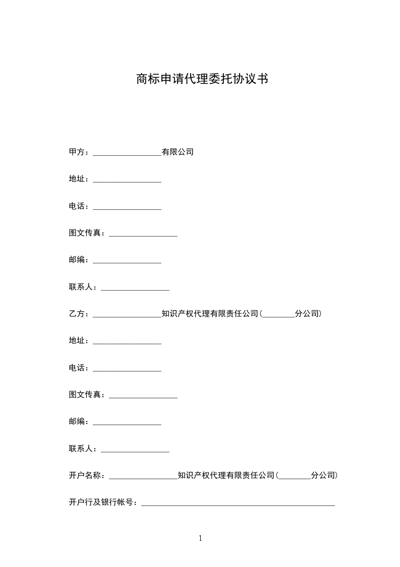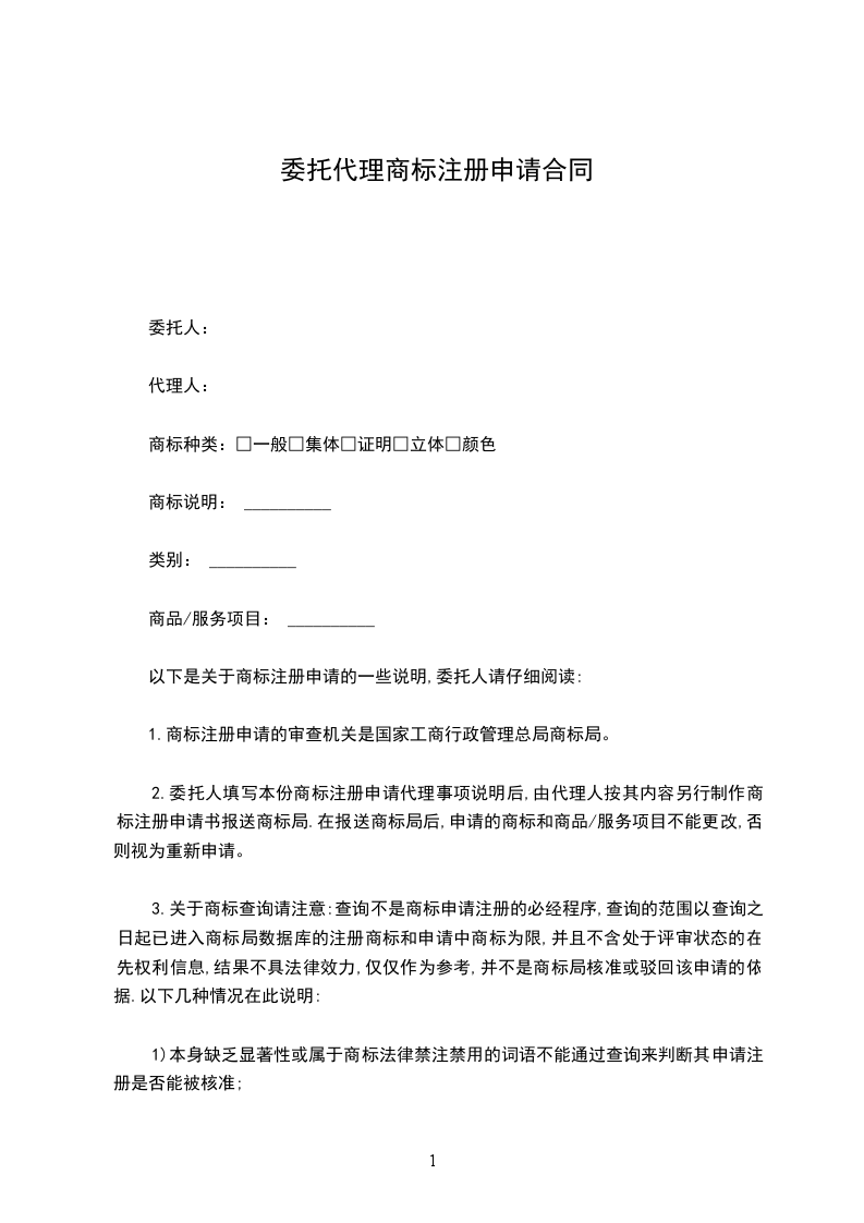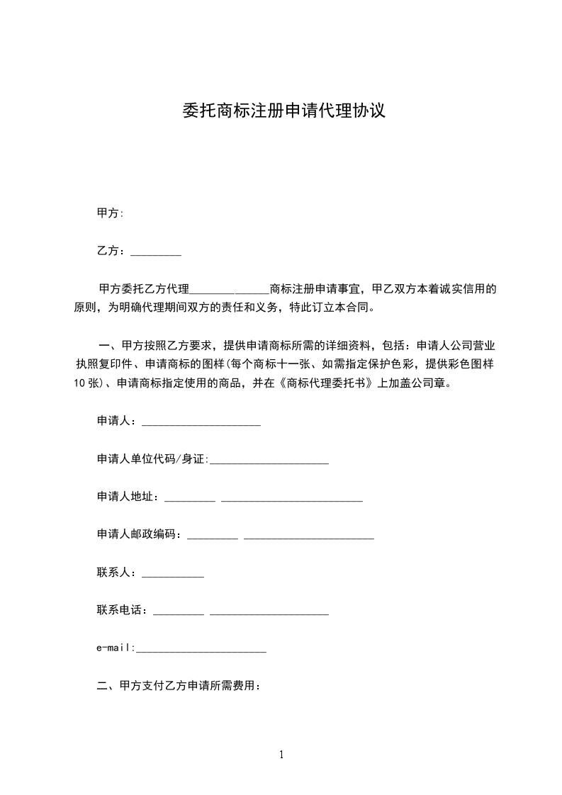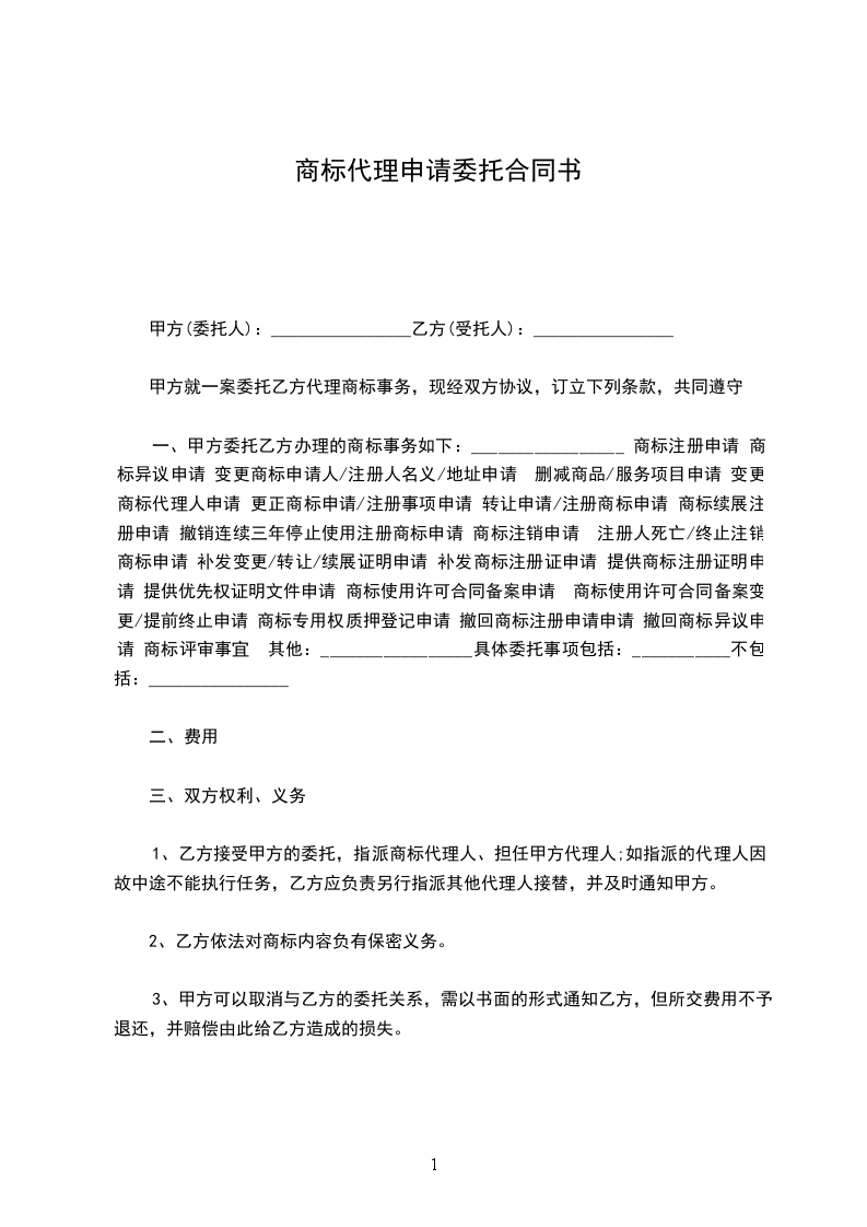 一、乙方接受甲方的委托,为甲方办理本合同项下的商标事务;
