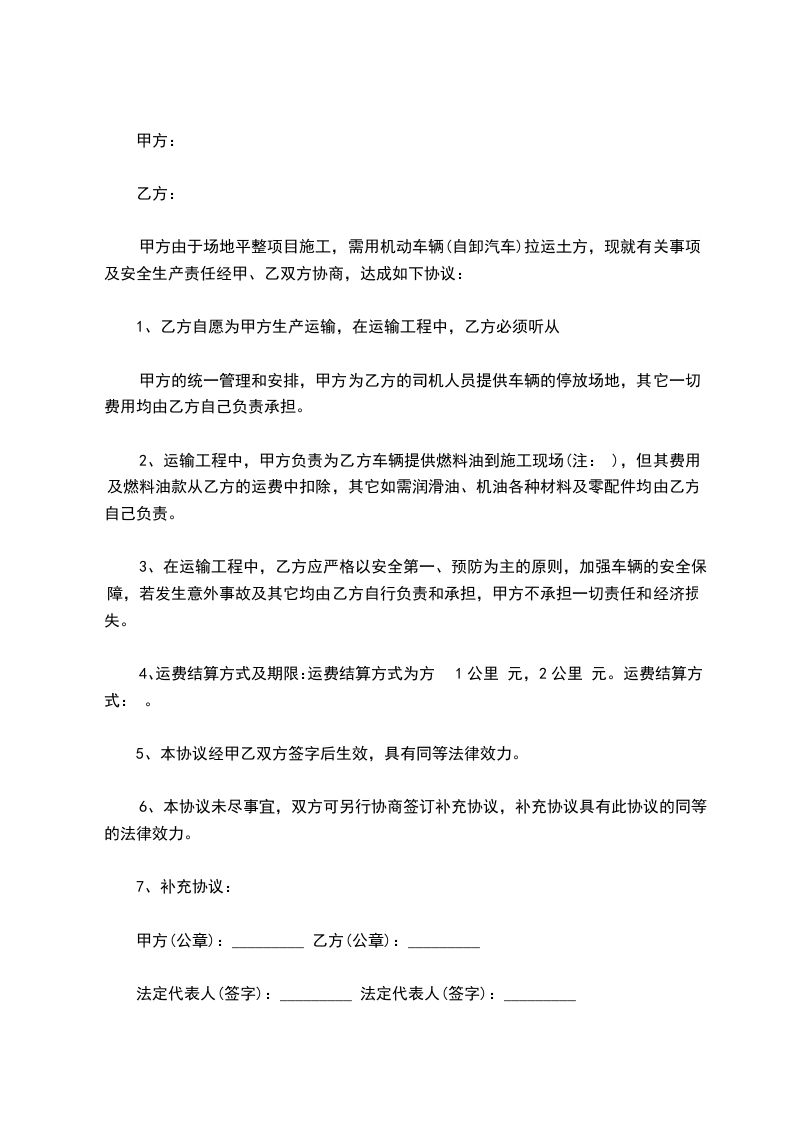 甲方由于场地平整项目施工,需用机动车辆(自卸汽车)拉运土方,现就有关事项及安全生产责任经甲、乙双方协商,达成如下协议: