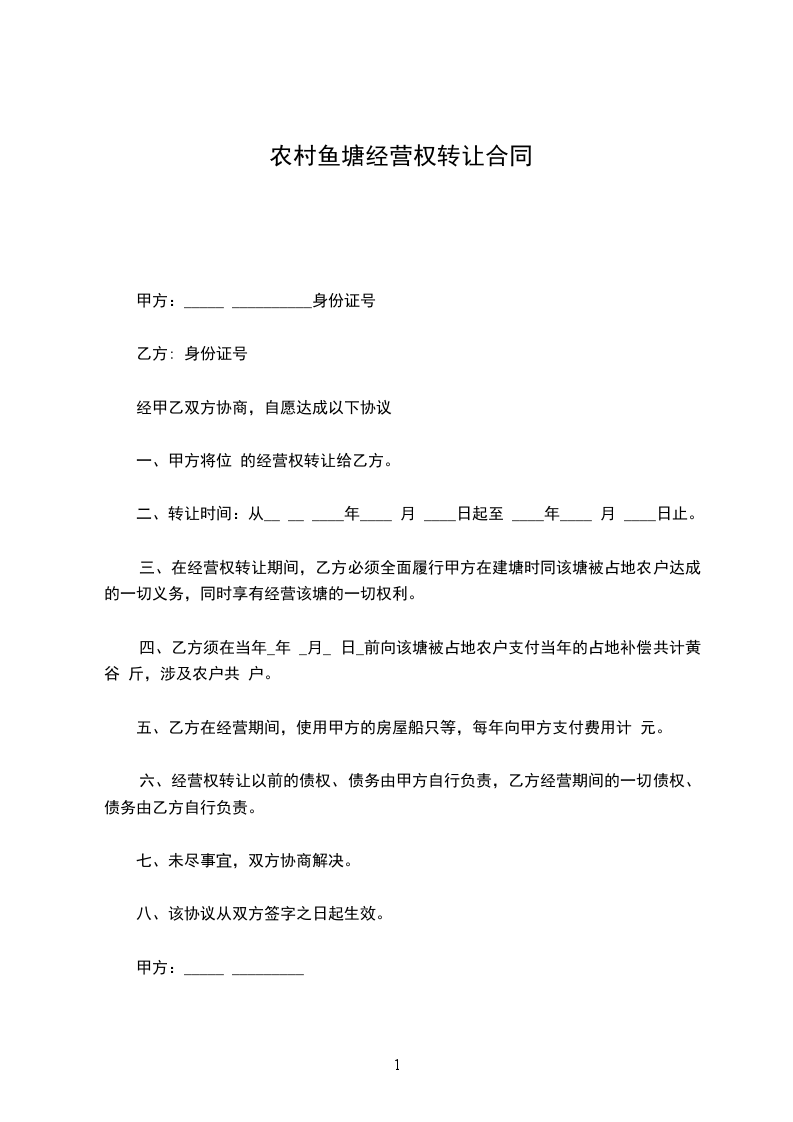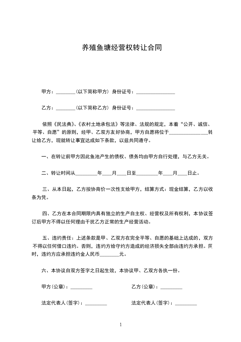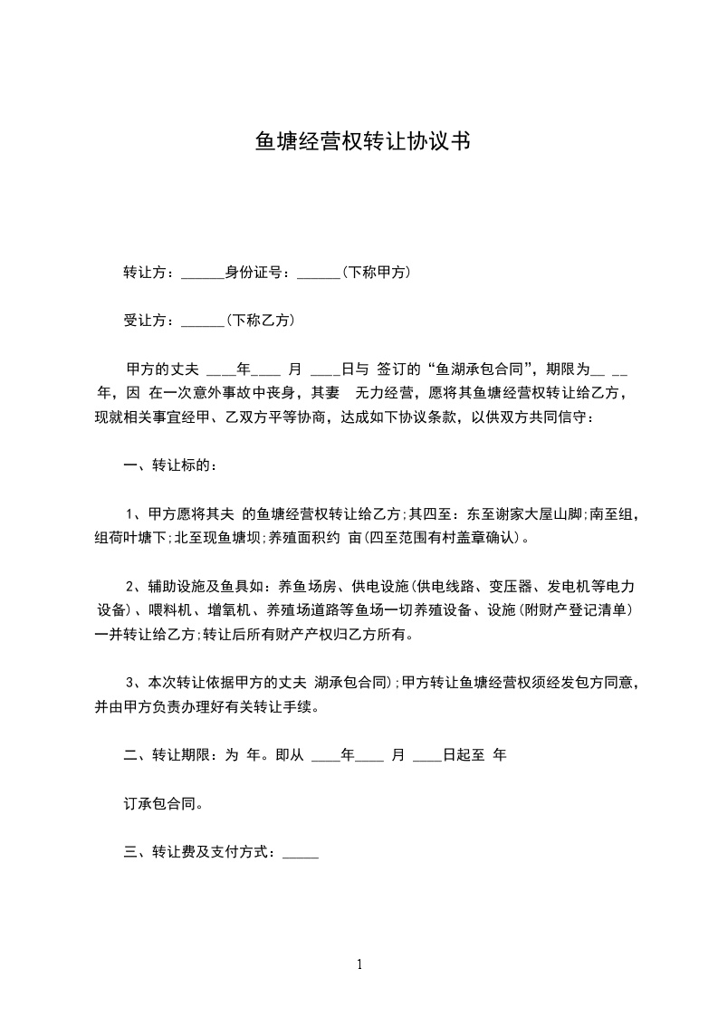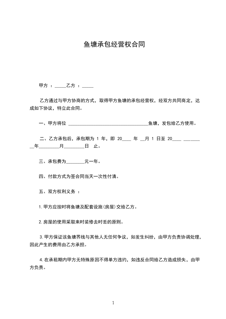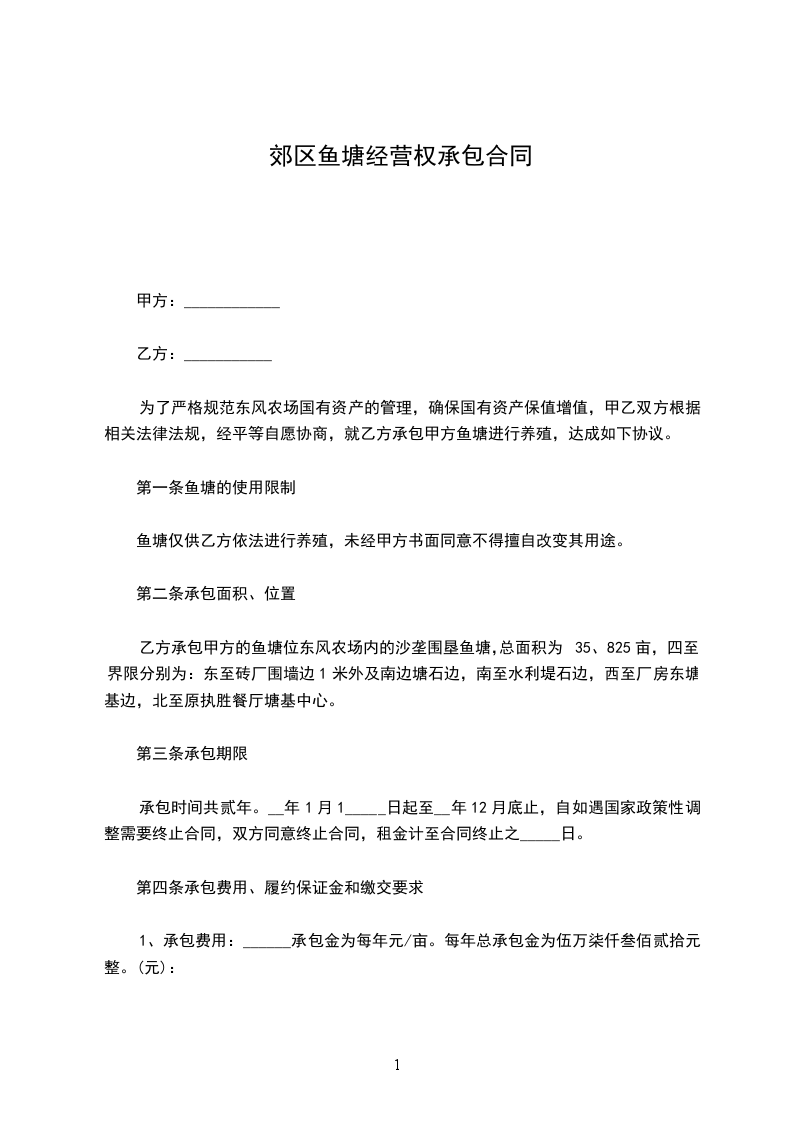 第一条承包地点和面积甲方将位于____鱼塘(河道、水库、湖面)____亩,承包给乙方养鱼,鱼塘(河道、水库、湖面)的所有权归甲方,乙方有管理使用权和合同规定的受益权,但不准出卖、出租或转让,在承包期内,乙方如去世,其家庭成员享有承包继承权。