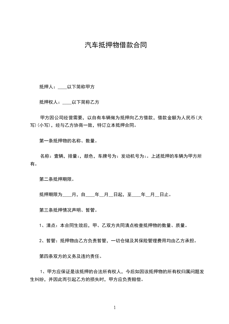 甲方因公司经营需要,以自有车辆做为抵押向乙方借款,借款金额为人民币(大写)(小写),经与乙方协商一致,特订立本抵押合同。