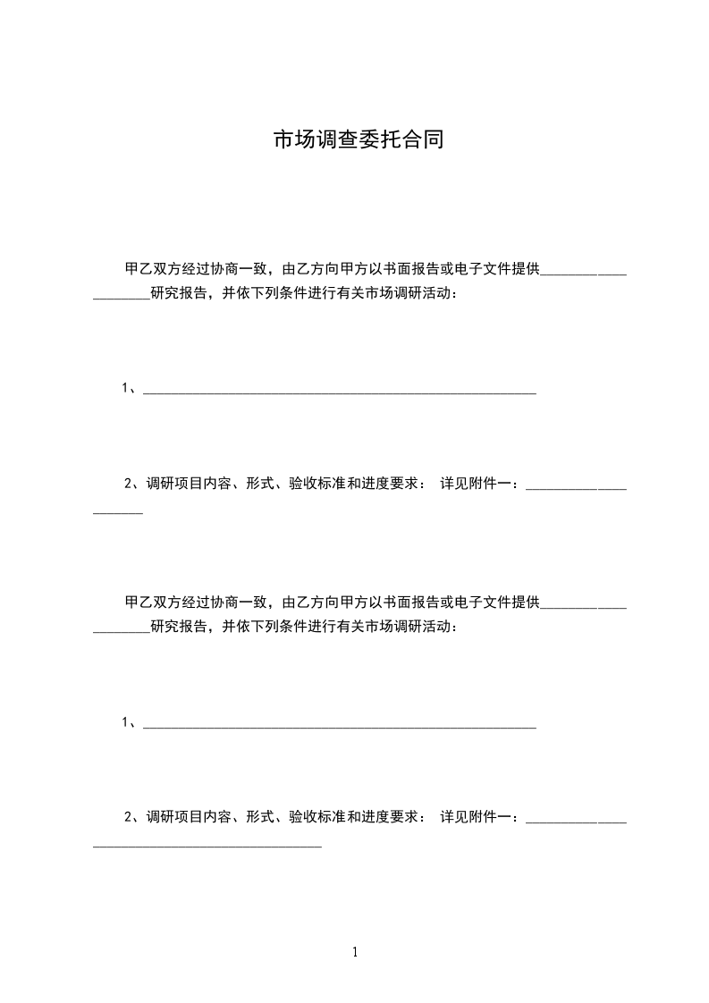 甲乙双方经过协商一致,由乙方向甲方以书面报告或电子文件提供____________________研究报告,并依下列条件进行有关市场调研活动: