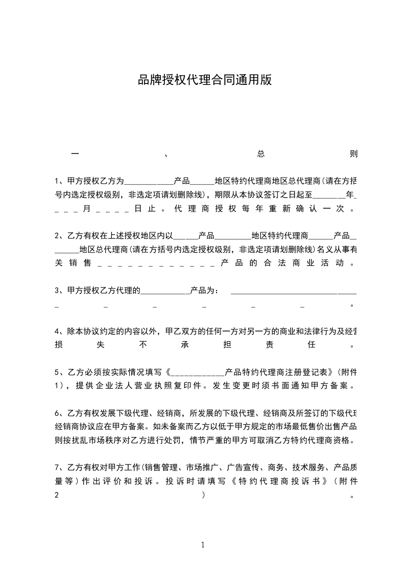 1、甲方首次授权乙方为地区特约代理商或总代理商时(每年确认一次不包括在内),乙方必须至少订购甲方授权代理的____________的一定定货量(见四条4款),乙方方可成为甲方地区特约代理商或总代理商,享受地区特约代理价或总代理价及本协议规定的有关权益。