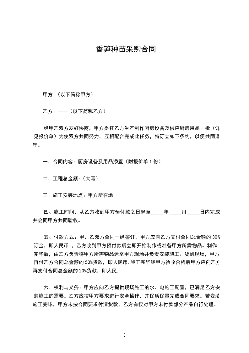 经甲乙双方友好协商,甲方委托乙方生产制作厨房设备及供应厨房用品一批(详见报价单)为使双方共同努力,互相配合完成此任务,特订立如下条约,以便共同遵守。