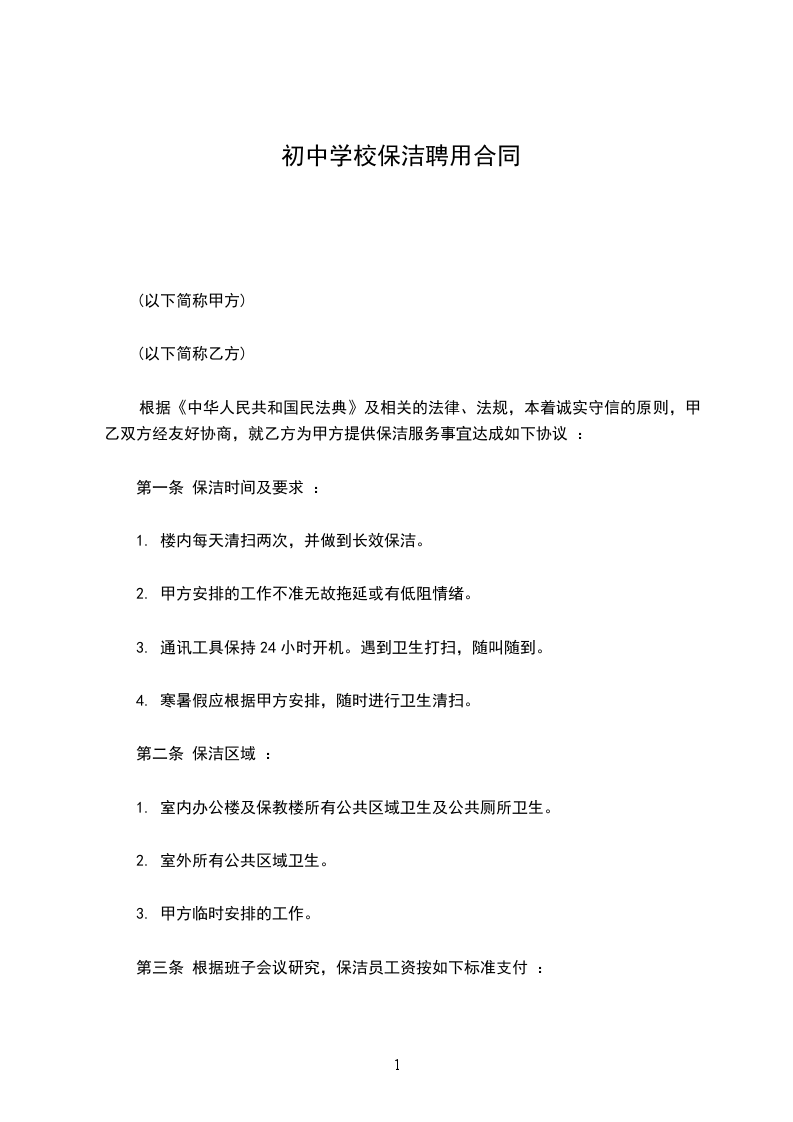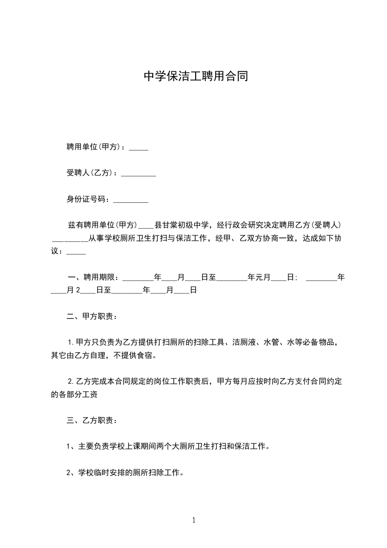 兹有聘用单位(甲方)____县甘棠初级中学,经行政会研究决定聘用乙方(受聘人)_________从事学校厕所卫生打扫与保洁工作,经甲、乙双方协商一致,达成如下协议:_____