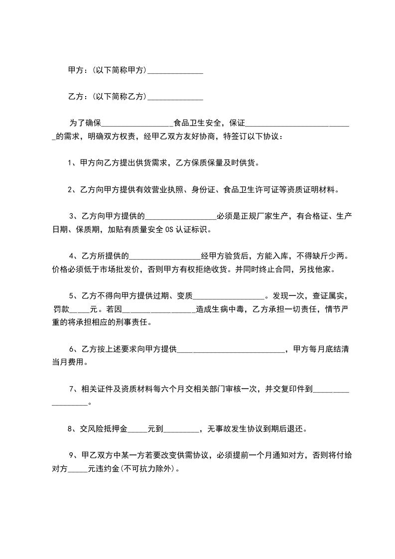 五、需方提供的商品必须符合食品检验标准,应将商品合格证(或质量保证书)和必要的资料以及证件等随同商品货运单交付供方,若资料不全,供方有权拒收或退货,退货费用皆由需方承担。