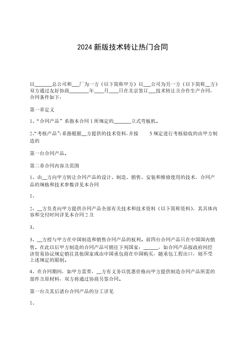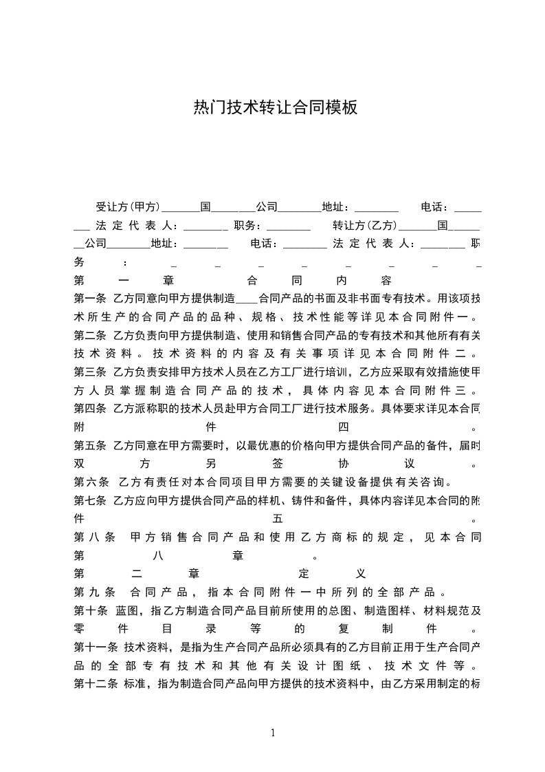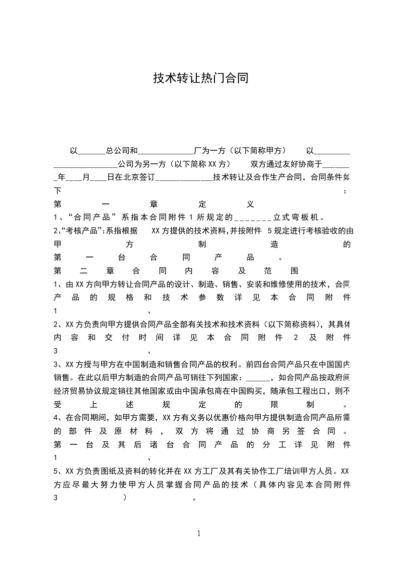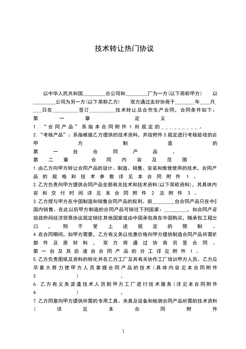 1.由乙方向甲方转让合同产品的设计、制造、销售、安装和维修使用的技术,合同产品的规格和技术参数详见本合同附件1。