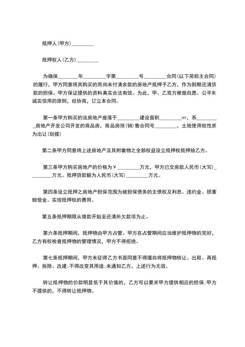 为确保________年_________字第_________号_________合同(以下简称主合同)的履行,甲方同意将其购买的而尚未付清余款的房地产抵押予乙方,作为到期还清贷款的担保。甲方保证提供的资料真实合法有效。为此,甲、乙双方根据自愿、公平和诚实信用的原则,经协商,订立本合同。