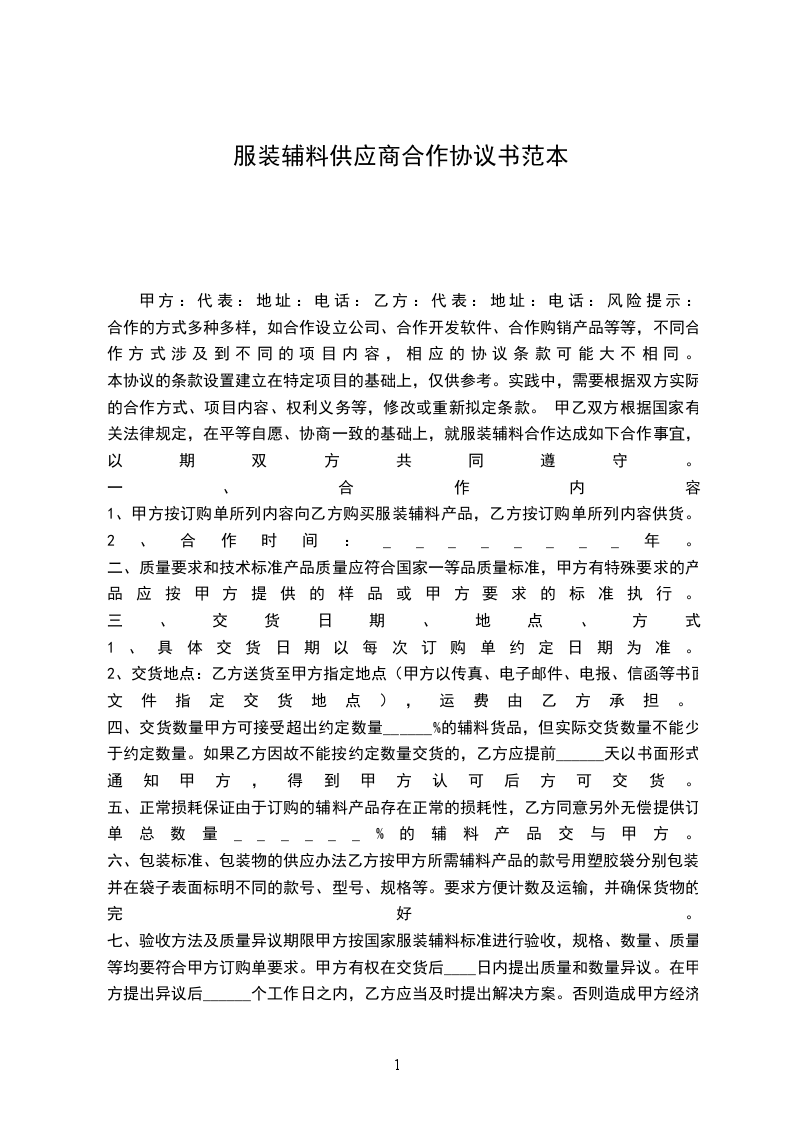 本协议的条款设置建立在特定项目的基础上,仅供参考。实践中,需要根据双方实际的合作方式、项目内容、权利义务等,修改或重新拟定条款。 甲乙双方根据国家有关法律规定,在平等自愿、协商一致的基础上,就服装辅料合作达成如下合作事宜,以期双方共同遵守。