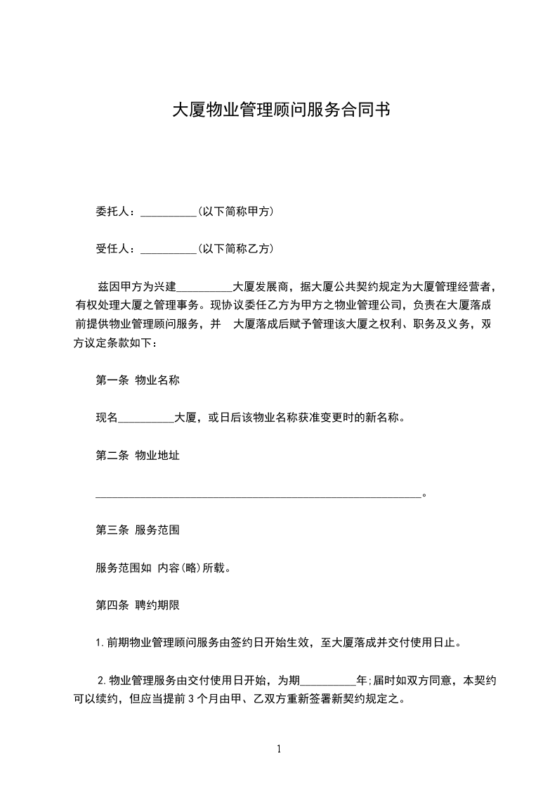 甲、乙双方在自愿、平等、协商一致的基础上,甲方为所其坐落于________市________区________小区的物业(以下简称“该项目”)委托乙方提供物业管理顾问服务。甲乙双方本着平等、互利、互谅、互让的精神,于_____年_____月_____日订立本合同。