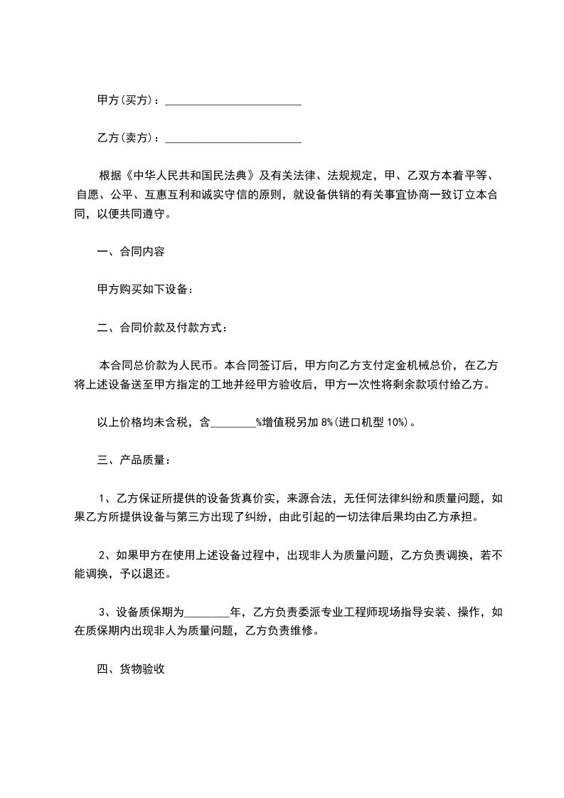 根据《中华人民共和国民法典》及有关法律、法规规定,甲、乙双方本着平等、自愿、公平、互惠互利和诚实守信的原则,就设备供销的有关事宜协商一致订立本合同,以便共同遵守。