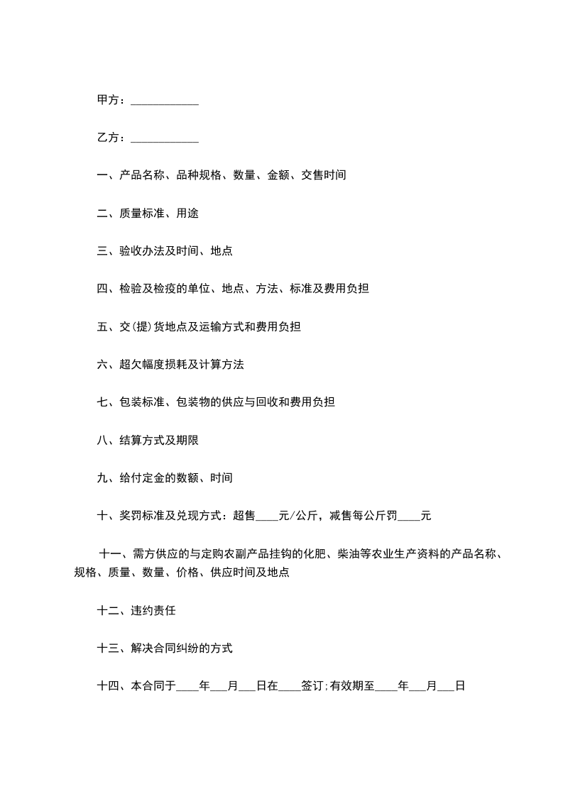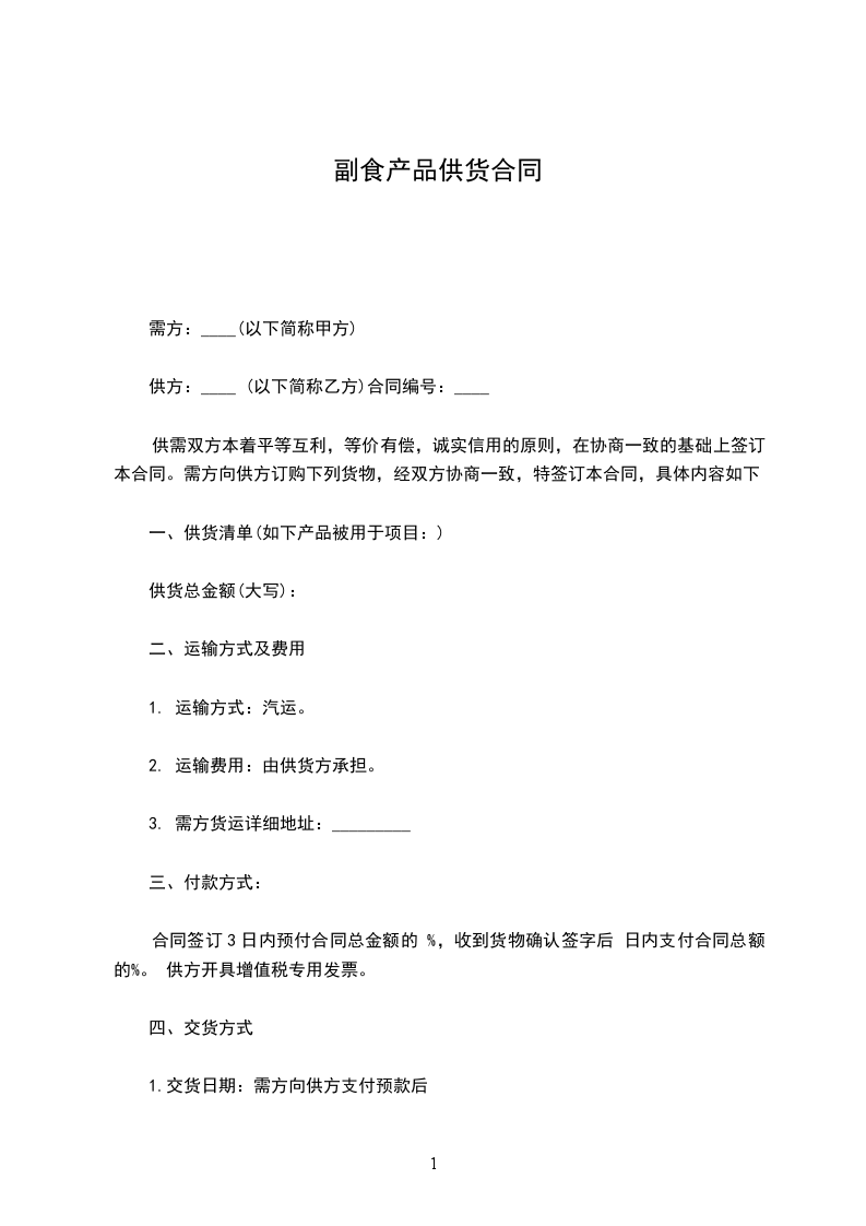 2、乙方未按合同约定供货的,按延迟供货的部分款,每延迟___________日承担货款的___________%违约金,延迟___________日以上的,除支付违约金外,甲方有权解除合同。